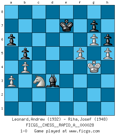 Last move : 1-0 2007 December 15 9:57:45 [Event "FICGS__CHESS__RAPID_A__000028"] [Site "FICGS"] [Date "2007.10.06"] [Round "1"] [White "Leonard,Andrew"] [Black "Riha,Josef"] [Result "1-0"] [WhiteElo "1932"] [BlackElo "1948"] 1.e4 e6 2.d4 d5 3.Nc3 Nf6 4.e5 Nfd7 5.f4 c5 6.Nf3 Nc6 7.Be3 cxd4 8.Nxd4 Bc5 9.Qd3 Bxd4 10.Bxd4 O-O 11.O-O-O f6 12.exf6 Nxd4 13.Qxd4 Qxf6 14.g3 Qxd4 15.Rxd4 Nc5 16.b4 Nd7 17.Nb5 Nb8 18.Rd2 Nc6 19.a3 Bd7 20.Nd6 b6 21.c4 Ne7 22.Bg2 Rf6 23.Re1 Kf8 24.cxd5 exd5 25.Bxd5 Nxd5 26.Rxd5 Ba4 27.Re2 a6 28.Red2 Rd8 29.Kb2 Re6 30.Nc4 Rxd5 31.Rxd5 Rc6 32.Ne3 Ke8 33.Rh5 h6 34.h4 Kf7 35.Rf5+ Ke8 36.Rd5 Rf6 37.Kc3 Rc6+ 38.Kd2 Bb3 39.Rd3 Be6 40.h5 Kf8 41.Rd8+ Ke7 42.Ra8 Rd6+ 43.Ke2 b5 44.Ra7+ Kf8 45.g4 Bd7 46.g5 Bc8 47.Kf3 Rd7 48.Rxd7 Bxd7 49.g6 Bc6+ 50.Kg4 Be4 51.Nd1 Ke7 52.Nc3 Bd3 53.f5 1-0 French : Steinitz, Boleslavsky variation Kingside Castling by player Black (move 10) Queenside Castling by player White (move 11) Player White won this chess game. Follow this game move after move (download)Fischer prefers to enter Chess history alone. (Miguel Najdorf) Über Frauen: Chess is better. (Robert James Fischer) Personalmente, yo prefiero mirar hacia el futuro en donde un programa de computadora gane el título mundial de Ajedrez. La humanidad necesita una lección de humildad. (Richard Dawkings) On est toujours la mazette de quelqu'un d'autre. (Anonyme) Fear is the path to the dark side. Fear leads to anger; anger leads to hate; hate leads to suffering. I sense much fear in you. (Master Yoda in Star Wars ep.1)