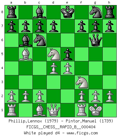 Last move : 1-0 2025 August 29 18:44:45 [Event "FICGS__CHESS__RAPID_B__000404"] [Site "FICGS"] [Date "2025.08.21"] [Round "1"] [White "Phillip,Lennox"] [Black "Pintor,Manuel"] [Result "1-0"] [WhiteElo "1979"] [BlackElo "1739"] 1.e4 e5 2.Nf3 Nc6 3.Bb5 Qf6 4.Nc3 Qg6 5.O-O Bc5 6.Nd5 Bb6 7.d4 exd4 8.Nh4 Qd6 9.Bf4 Ne5 10.Nf5 Qg6 11.Bxe5 c6 12.Nf4 Qg5 13.h4 Qd8 14.Nxg7+ Kf8 15.Bd6+ Kxg7 16.Qg4+ 1-0 Follow this game move after move (download)Place the contents of the Chess box in a hat, shake them up vigorously, pour them on the board from a height of two feet, and you get the style of Steinitz. (H. E. Bird) Der beste Spieler in einem Turnier gewinnt es nie. Er landet auf Platz zwei oder drei. (Siegbert Tarrasch) Un buen sacrificio es aquel que aunque no sea necesariamente sólido, deja a tu oponente aturdido y confuso. (Rudolph Spielmann) On entre au jeu d'Echecs comme on entre en Religion. Pour le joueur d'Echecs, la partie d'Echecs c'est l'office, la messe, le défilé du 1er Mai, le dépôt de gerbe au Monument aux Morts. C'est un drame sacré. (Michel Roos) There are lots of people who mistake their imagination for their memory. (Josh Bilings)