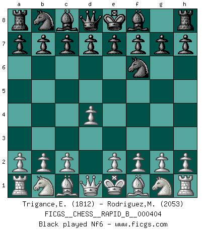 Last move : 0-1 2025 October 25 13:42:31 [Event "FICGS__CHESS__RAPID_B__000404"] [Site "FICGS"] [Date "2025.08.21"] [Round "1"] [White "Trigance,Emile"] [Black "Rodriguez,Mariano"] [Result "0-1"] [WhiteElo "1812"] [BlackElo "2053"] 1.d4 Nf6 2.c4 e6 3.Nc3 Bb4 4.a3 Bxc3+ 5.bxc3 c5 6.f3 d6 7.e4 Nc6 8.Be3 b6 9.Bd3 O-O 10.Ne2 Qc7 11.O-O Na5 12.Nc1 Ba6 13.Qe2 cxd4 14.cxd4 Bxc4 15.Bxc4 Qxc4 16.Bf2 Rfc8 17.Qxc4 Rxc4 18.Rd1 d5 0-1 This chess game has been lost on time (started : 2025.08.21 21:24:14) Follow this game move after move (download)When asked, -How is that you pick better moves than your opponents?, I responded: I'm very glad you asked me that, because, as it happens, there is a very simple answer. I think up my own moves, and I make my opponent think up his. (Alexander Alekhine) Wenn Dein Gegner dir ein Remis anbietet, versuch herauszufinden, weshalb er glaubt schlechter zu stehen. (Nigel Short) Al jugar al Ajedrez entonces, podemos aprender: Primero: Previsión... Segundo: Prudencia... Tercero: Cautela... Y al final, aprendemos del Ajedrez el hábito de no ser desanimados por apariencias malas presentes en el estado de nuestros asuntos, el hábito de la esperanza por una oportunidad favorable y la perseveración de los secretos de los recursos. (Benjamin Franklin) Vous n'êtes pas toujours obligé de jouer le meilleur coup. Un coup doit être actif, entreprenant, correct et beau ! (David Bronstein) Whatever you do, don't be bored. This is absolutely the most exciting time we could have possibly hoped to be alive. And things are just starting. (From movie Waking life)