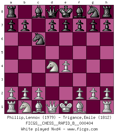 Last move : 1-0 2025 October 27 10:42:26 [Event "FICGS__CHESS__RAPID_B__000404"] [Site "FICGS"] [Date "2025.08.21"] [Round "1"] [White "Phillip,Lennox"] [Black "Trigance,Emile"] [Result "1-0"] [WhiteElo "1979"] [BlackElo "1812"] 1.e4 c5 2.Nf3 Nc6 3.d4 cxd4 4.Nxd4 Nf6 5.Nc3 e5 6.Ndb5 d6 7.Nd5 Nxd5 8.exd5 Nb8 9.a4 Be7 10.Be2 O-O 11.O-O f5 12.f4 a6 13.Na3 exf4 14.Bxf4 Nd7 15.Nc4 Nb6 16.b3 Nxc4 17.bxc4 Qc7 18.Rb1 Qc5+ 19.Kh1 g5 20.Bc1 Bf6 21.Bd3 Kg7 22.Qh5 1-0 This chess game has been lost on time (started : 2025.08.21 21:24:14) Follow this game move after move (download)It is peculiar but a fact nevertheless, that gamblers in chess always have enthusiastic followers. (Botvinnik) Ich bin Weltmeister und muß mit niemandem irgend etwas diskutieren. (Viswanathan Anand) Por esta medida (el intervalo entre Fischer y sus contemporaneos), yo le considero el mas grande campeón mundial. (Garry Kasparov) Nous vivons dans un monde échiquéen : chaque jour qui passe est un défi à relever. (Philosophe Sasha) When you have everything, sometimes it feels like nothing. (Horatio Caine, C.S.I. Miami)
