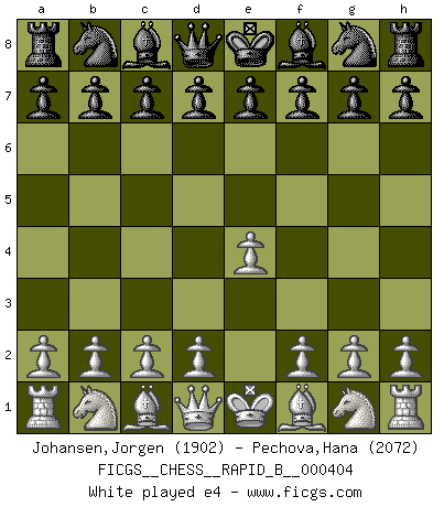 Last move : 0-1 2025 October 29 10:17:31 [Event "FICGS__CHESS__RAPID_B__000404"] [Site "FICGS"] [Date "2025.08.21"] [Round "1"] [White "Johansen,Jorgen"] [Black "Pechova,Hana"] [Result "0-1"] [WhiteElo "1902"] [BlackElo "2072"] 1.e4 e6 2.d4 d5 3.Nc3 Nf6 4.e5 Nfd7 0-1 This chess game has been lost on time (started : 2025.08.21 21:24:14) Follow this game move after move (download)Chess is a cold bath for the mind. (Sir John Simon) Wie kann ich Remis annehmen? Ich weiß ja gar nicht, wie ich stehe! (Fritz Sämisch) El Ajedrez es el juego mas altamente simbólico, pero las agresiones estan por lo tanto aún mas francamente representadas en la partida. Tal vez comenzo como un juego de guerra; Algo como la representación de una batalla en miniatura entre las fuerzas de dos reinos. (Karl Meninger) Il vaut toujours mieux jouer un plan faux de façon logique que de n'avoir pas de plan du tout. (Victor Kortchnoï) Creativity is inventing, experimenting, growing, taking risks, breaking rules, making mistakes, and having fun. (Mary Lou Cook)