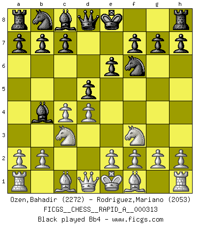 Last move : 1/2-1/2 2025 October 25 9:5:34 [Event "FICGS__CHESS__RAPID_A__000313"] [Site "FICGS"] [Date "2025.08.22"] [Round "1"] [White "Ozen,Bahadir"] [Black "Rodriguez,Mariano"] [Result "1/2-1/2"] [WhiteElo "2272"] [BlackElo "2053"] 1.d4 Nf6 2.c4 e6 3.Nf3 d5 4.Nc3 Bb4 5.Bg5 h6 6.Bxf6 Qxf6 7.e3 O-O 8.Rc1 dxc4 9.Bxc4 c5 10.O-O cxd4 11.Nxd4 Bd7 12.Ne4 Qe5 13.Be2 Rd8 14.Qc2 Nc6 15.Nf3 Qa5 16.a3 Bf8 17.Nc5 Bxc5 18.Qxc5 Qxc5 19.Rxc5 Rac8 20.Rfc1 Ne7 21.Kf1 f6 22.Nd4 Kf8 23.Bb5 Rxc5 24.Rxc5 e5 25.Bxd7 Rxd7 26.Nf3 h5 27.h3 Nf5 28.Ke2 h4 29.Nd2 Nd6 30.a4 Kf7 31.a5 Ke6 32.b4 Rd8 33.Rc7 Rd7 34.Rc5 Ke7 35.Nf3 g5 1/2-1/2 Follow this game move after move (download)Spassky will not be psyched out by Fischer. (Mike Goodall) Wenn ich Weiß habe gewinne ich weil ich Weiß habe, wenn ich Schwarz habe gewinne ich weil ich Bogoljubov bin. (Efim Bogoljubov) Si no le temes a Spassky, entonces elimino el elemento del dinero. (Jim Slater) J'ai toujours senti une vague pitié pour l'homme qui ne connaît rien aux échecs, tout comme j'en aurais pour un homme ignorant de l'amour. Les Echecs, comme la musique ou comme l'amour, ont le pouvoir de rendre heureux. (Siegbert Tarrasch) The leaves of memory seemed to make a mournful rustling in the dark. (Henry Wadsworth Longfellow)