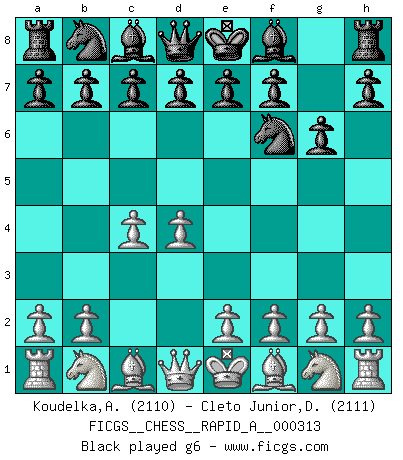 Last move : 1-0 2025 October 25 7:4:55 [Event "FICGS__CHESS__RAPID_A__000313"] [Site "FICGS"] [Date "2025.08.22"] [Round "1"] [White "Koudelka,Artur"] [Black "Cleto Junior,Dirceu"] [Result "1-0"] [WhiteElo "2110"] [BlackElo "2111"] 1.d4 Nf6 2.c4 g6 3.Nc3 Bg7 4.e4 d6 5.Nf3 O-O 6.Be2 e5 7.O-O Nc6 8.d5 Ne7 9.Ne1 Nd7 10.Nd3 f5 11.f3 a5 12.Be3 b6 13.a3 Nc5 14.Rc1 Kh8 15.h3 Ng8 16.b4 Nxd3 17.Bxd3 Bh6 18.Bxh6 Nxh6 19.c5 bxc5 20.bxc5 1-0 Follow this game move after move (download)In complicated positions, Bobby Fischer hardly had to be afraid of anybody. (Paul Keres) Fischer ist das größte Genie, das je vom Schachhimmel heruntergestiegen ist. (Mikhail Nekhemyevich Tal) Juega la Apertura como un libro, el Juego Medio como un mago y los Finales como una máquina. (Spielmann) Les écrivains ont utilisé les échecs pour analyser les côtés extrêmes de la nature humaine. Dans ce cadre, les échecs offrent un champ d'expérimentation idéal. Mais on pourrait faire la même chose avec la peinture. Et là, en vous référant à Van Gogh, vous ne tirerez pas de conclusion définitive sur les peintres. (Gary Kasparov) Chess is everything: art, science and sport. (Anatoly Karpov)