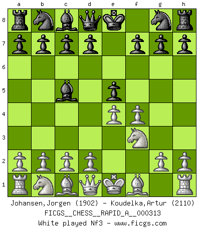 Last move : 0-1 2025 November 3 14:11:25 [Event "FICGS__CHESS__RAPID_A__000313"] [Site "FICGS"] [Date "2025.08.22"] [Round "1"] [White "Johansen,Jorgen"] [Black "Koudelka,Artur"] [Result "0-1"] [WhiteElo "1902"] [BlackElo "2110"] 1.e4 e5 2.f4 Bc5 3.Nf3 d6 4.c3 f5 5.d4 exd4 6.cxd4 Bb4+ 0-1 This chess game has been lost on time (started : 2025.08.22 1:23:6) Follow this game move after move (download)Capture of the adverse King is the ultimate but not the first object of the game. (William Steinitz) Jede Eröffnung ist gut genug um gespielt zu werden, wenn nur ihr Ruf schlecht genug ist. (Savielly Grigorievitsch Tartakower) Del Ajedrez se ha dicho que la vida no es lo suficientemente larga para él, pero eso es culpa de la vida, no del Ajedrez. (William Ewart Napier) RxDa4 pat (...) A married woman is like a fish riding a bicycle. (Rodolfo d'Ettorre)