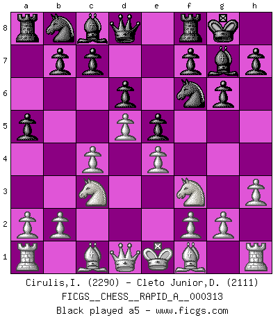 Last move : 1-0 2025 August 29 20:40:35 [Event "FICGS__CHESS__RAPID_A__000313"] [Site "FICGS"] [Date "2025.08.22"] [Round "1"] [White "Cirulis,Ilmars"] [Black "Cleto Junior,Dirceu"] [Result "1-0"] [WhiteElo "2290"] [BlackElo "2111"] 1.c4 Nf6 2.d4 g6 3.Nc3 Bg7 4.e4 d6 5.Nf3 O-O 6.h3 e5 7.d5 a5 8.Be3 Nfd7 9.g4 Na6 10.a3 Nb6 11.Rg1 Bd7 12.Be2 Nc5 13.b3 Kh8 14.g5 h5 15.gxh6 1-0 Follow this game move after move (download)I played Chess with him and would have beaten him sometimes only he always took back his last move, and ran the game out differently. (Mark Twain) Mit sehr nachdenklichem Gesicht schreitet Bobby durch den Turniersaal. Was ist passiert?, fragt Lombardy. Ich stehe schlecht, antwortet Fischer. Lombardy: Dann biete doch einfach Remis an. Fischer: So schlecht stehe ich nun auch wieder nicht! (Robert James Fischer) Tu sabes, camarada Pachman, no disfruto el ser un Ministro, preferería jugar al Ajedrez como tu. (Che Guevara) Lorsque vous vous retrouvez devant une position atroce, ne tendez pas un ultime piège dérisoire avec l'intention d'abandonner si l'adversaire le déjoue ! Faites-vous plutôt un devoir de résister comme si votre vie en dépendait. Jouez le coup qui vous déplairait au centuple si vous étiez dans la peau de votre tortionnaire ! There's always a bigger fish. (Qui-Gon Jinn in Star Wars ep.1)