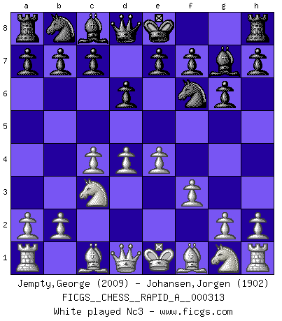 Last move : 1-0 2025 October 6 6:32:5 [Event "FICGS__CHESS__RAPID_A__000313"] [Site "FICGS"] [Date "2025.08.22"] [Round "1"] [White "Jempty,George"] [Black "Johansen,Jorgen"] [Result "1-0"] [WhiteElo "2009"] [BlackElo "1902"] 1.d4 Nf6 2.c4 g6 3.f3 Bg7 4.e4 d6 5.Nc3 O-O 6.Nge2 c5 7.d5 e6 8.Ng3 exd5 9.cxd5 h5 10.Bg5 1-0 This chess game has been lost on time (started : 2025.08.22 1:23:6) Follow this game move after move (download)Who is your opponent tonight, tonight I am playing against the Black pieces. (Akiba Rubinstein) Die westlichen Werte sind eine Sprache, welche die Putin-Administration nicht versteht. (Garry Kasparov) El Ajedrez es tortura mental. (Garry Kasparov) Vouloir jouer aux échecs contre soi-même est aussi paradoxal que vouloir marcher sur son ombre. (Stefan Zweig) Be who you are, and say what you feel because those who mind don't matter, and those who matter don't mind. (Dr Seuss)