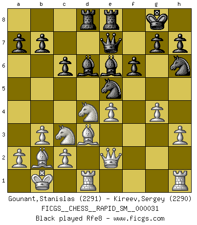 Last move : 1/2-1/2 2025 September 1 13:35:59 [Event "FICGS__CHESS__RAPID_SM__000031"] [Site "FICGS"] [Date "2025.08.22"] [Round "1"] [White "Gounant,Stanislas"] [Black "Kireev,Sergey"] [Result "1/2-1/2"] [WhiteElo "2291"] [BlackElo "2290"] 1.b3 e5 2.Bb2 Nc6 3.e3 d5 4.Bb5 Bd6 5.f4 Qh4+ 6.g3 Qe7 7.Nf3 f6 8.Nc3 Be6 9.h3 Nh6 10.g4 exf4 11.Qe2 O-O 12.O-O-O fxe3 13.dxe3 Ne5 14.e4 d4 15.Nxd4 c6 16.Bd3 Rad8 17.Kb1 Rfe8 18.Qe3 Bc8 19.Nf5 Nxf5 20.exf5 Nxd3 21.Qxd3 b5 22.a4 Bc7 23.Qf3 b4 24.Na2 Qe4 25.Qf2 Bb6 26.Qg3 Rxd1+ 27.Rxd1 Qe2 28.Qd6 Bc5 29.Nc1 Bxd6 30.Nxe2 Bh2 31.Nd4 c5 32.Nc6 Bb7 33.Nxa7 h5 34.Ka2 hxg4 1/2-1/2 Follow this game move after move (download)You can only get good at Chess if you love the game. (Bobby Fischer) Im Schach gewinnt jeder. Hat man Freunde am Spiel - und das ist die Hauptsache - ist auch der Verlust einer Partie kein Unglück. (David Bronstein) Aún deseo matar a Fischer. (Boris Spassky) Comme les marins qui ont mille raisons différentes d'aller en mer, les joueurs d'échecs en ont tout autant avant de s'installer devant une table et jouer... (Vincent Bertignac, philosophe) Art is the triumph over chaos. (John Cheever)