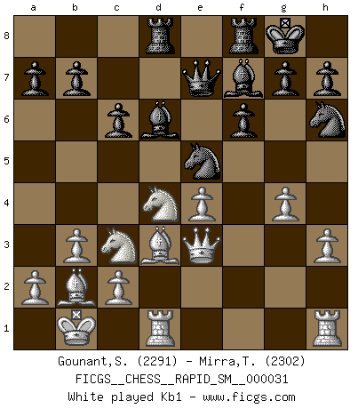 Last move : 1/2-1/2 2025 August 28 18:50:3 [Event "FICGS__CHESS__RAPID_SM__000031"] [Site "FICGS"] [Date "2025.08.22"] [Round "1"] [White "Gounant,Stanislas"] [Black "Mirra,Theodore"] [Result "1/2-1/2"] [WhiteElo "2291"] [BlackElo "2302"] 1.b3 e5 2.Bb2 Nc6 3.e3 d5 4.Bb5 Bd6 5.f4 Qh4+ 6.g3 Qe7 7.Nf3 f6 8.Nc3 Be6 9.h3 Nh6 10.g4 exf4 11.Qe2 O-O 12.O-O-O fxe3 13.dxe3 Ne5 14.e4 d4 15.Nxd4 c6 16.Bd3 Bf7 17.Qe3 Rad8 18.Kb1 Nxd3 19.Rxd3 Rfe8 20.Qf3 Be5 21.Rhd1 Bg6 22.Nf5 Nxf5 23.Rxd8 Rxd8 24.Rxd8+ Qxd8 25.exf5 Bf7 26.Ne4 1/2-1/2 Follow this game move after move (download)Chess is life. (Bobby Fischer) Ich suche im Schach immer etwas Eigenes. Riskantes Spiel im Stile schachlicher Musketiere ist nicht meine Sache, auch wenn es vielen Freunden scharfer Wendungen gefällt. (Anatoly Karpov) ¿Que sería del Ajedrez sin errores graciosos?. (Kurt Richter) Shah mat. Le roi est mort. Cri de fierté d'un joueur venant de terrasser son adversaire, courtoisement, sans effusion de sang. The worth of a book is to be measured by what you can carry away from it. (James Bryce)