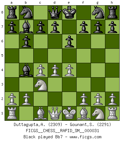 Last move : 1/2-1/2 2025 December 11 16:34:30 [Event "FICGS__CHESS__RAPID_SM__000031"] [Site "FICGS"] [Date "2025.08.22"] [Round "1"] [White "Duttagupta,Aniruddha"] [Black "Gounant,Stanislas"] [Result "1/2-1/2"] [WhiteElo "2309"] [BlackElo "2291"] 1.d4 e6 2.c4 b6 3.e4 Bb4+ 4.Nc3 Bb7 5.f3 f5 6.exf5 Nh6 7.fxe6 Nf5 8.Bf4 dxe6 9.Qa4+ Nc6 10.d5 Bxc3+ 11.bxc3 exd5 12.O-O-O O-O 13.cxd5 Na5 14.Nh3 Qf6 15.Qc2 h6 16.g4 Nd6 17.Bd3 Ndc4 18.Rhe1 Na3 19.Qd2 N5c4 20.Bxc4 Nxc4 21.Qd3 Ba6 22.Re6 Qf7 23.Bxh6 Qxf3 24.Rg6 Qxd3 25.Rxg7+ Kh8 26.Rxd3 Rf6 27.g5 Rf1+ 28.Rd1 Rf3 29.Re1 Rxc3+ 30.Kb1 Rxh3 31.R1e7 Na3+ 32.Kb2 Bd3 33.Kxa3 Rd8 34.Kb2 Rxh2+ 35.Kc1 Rf8 36.Re1 Rc2+ 37.Kd1 Rxa2 38.g6 Bc2+ 39.Kc1 Bxg6 40.Rxg6 Kh7 41.Rg3 Ra1+ 42.Kb2 Rxe1 43.Bxf8 Re8 44.Bb4 Re5 45.Rd3 Re4 46.Bd2 Kg6 47.Kc3 Kf5 48.Rh3 Ra4 49.Rh5+ Kf6 50.Kd3 Ke7 51.Rf5 Kd7 52.Bf4 Ra5 53.Rh5 Kc8 54.Rf5 Rc5 55.Be3 Rb5 56.Kc4 Rb2 57.Bf4 Rc2+ 58.Kd3 Rc5 59.Be3 Rb5 60.Kc4 Rb2 61.Rf8+ Kb7 62.Rf7 Kc8 63.Bf4 Rc2+ 64.Kd3 Rc5 65.Kd4 a5 66.Rf6 Kb7 67.Rg6 Rc2 68.Rg3 Rf2 69.Ke4 Rc2 70.Kd4 Rf2 71.Be5 Rf7 72.Ra3 Ka8 1/2-1/2 Follow this game move after move (download)A bad day of Chess is better than any good day at work. (Anonymous) Ich würde mich als ganz normalen Jungen bezeichnen [Im Alter von 12]. (Sergej Karjakin) Para mi, el Ajedrez es la vida y cada partida es como una nueva vida. Todo jugador de Ajedrez suele vivir muchas vidas durante su vida. (Eduard Gufeld) J'apprécie les joueurs d'est-indienne, c'est grâce à eux que je nourris ma famille depuis tant d'années. (Petrosian) No, I am still playing. (Anatoly Karpov)