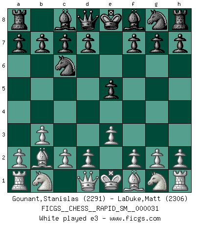 Last move : 1/2-1/2 2025 October 3 15:26:27 [Event "FICGS__CHESS__RAPID_SM__000031"] [Site "FICGS"] [Date "2025.08.22"] [Round "1"] [White "Gounant,Stanislas"] [Black "LaDuke,Matt"] [Result "1/2-1/2"] [WhiteElo "2291"] [BlackElo "2306"] 1.b3 e5 2.Bb2 Nc6 3.e3 d5 4.Bb5 Nge7 5.Bxe5 a6 6.Bxc6+ Nxc6 7.Bg3 h5 8.h4 d4 9.Ne2 Bd6 10.exd4 Bxg3 11.Nxg3 Nxd4 12.Nc3 O-O 13.Kf1 a5 14.d3 Ra6 15.Nxh5 Rc6 16.Qd2 Bg4 17.Ng3 f5 18.f3 Qf6 19.fxg4 fxg4 20.Ke1 Rxc3 21.Ne4 Re8 22.Qxc3 Rxe4+ 23.dxe4 Nf3+ 24.Qxf3 gxf3 25.Kf2 fxg2 26.Kxg2 Qc6 27.Rhe1 1/2-1/2 Follow this game move after move (download)Chess teaches you to control the initial excitement you feel when you see something that looks good and it trains you to think objectively when you're in trouble. (Stanley Kubrick) Wenn Capablanka heute auf der Schachbühne erscheinen würde, hätte er ein halbes Jahr gebraucht um sich die Schachtheorie anzueignen. Und dann hätte er alles und jeden besiegt. (Mikhail Moiseyevich Botvinik) Del Ajedrez se ha dicho que la vida no es lo suficientemente larga para él, pero eso es culpa de la vida, no del Ajedrez. (William Ewart Napier) Aucun coup ne doit être joué sans but. (Pedro Damiano) Whenever people agree with me, I always feel I must be wrong. (Oscar Wilde)