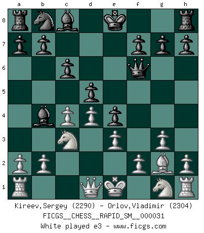 Last move : 1/2-1/2 2025 September 2 11:17:0 [Event "FICGS__CHESS__RAPID_SM__000031"] [Site "FICGS"] [Date "2025.08.22"] [Round "1"] [White "Kireev,Sergey"] [Black "Orlov,Vladimir"] [Result "1/2-1/2"] [WhiteElo "2290"] [BlackElo "2304"] 1.c4 e5 2.g3 Nf6 3.Bg2 c6 4.d4 e4 5.Bg5 d5 6.Bxf6 Qxf6 7.Nc3 Bb4 8.e3 O-O 9.Nge2 Nd7 10.Qb3 Qd6 11.O-O Bxc3 12.Nxc3 Nf6 13.cxd5 cxd5 14.Rfc1 h5 15.Nb5 Qd8 16.Nc7 Rb8 17.Rc5 Nd7 18.Rc2 Nf6 19.Rc5 Nd7 20.Rc2 1/2-1/2 Follow this game move after move (download)A good sacrifice is one that is not necessarily sound but leaves your opponent dazed and confused. (Rudolph Spielmann) Wir irren allesamt, nur jeder irrt anders. (Georg Christoph Lichtenberg) Un jugador que es sorprendido, esta derrotado a medias. (Proverbio) Toutes les manuvres exécutées sur une colonne ouverte ont pour but ultime l'intrusion définitive sur la septième ou la huitième rangée, en plein cur de la position ennemie. (Aaron Nimzovitch) When the going gets tactical, the computers get going. (Hyatt)