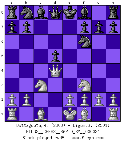 Last move : 1/2-1/2 2026 January 6 18:5:29 [Event "FICGS__CHESS__RAPID_SM__000031"] [Site "FICGS"] [Date "2025.08.22"] [Round "1"] [White "Duttagupta,Aniruddha"] [Black "Ligon,Scott"] [Result "1/2-1/2"] [WhiteElo "2309"] [BlackElo "2301"] 1.d4 d5 2.Nf3 Nf6 3.c4 e6 4.Nc3 c5 5.cxd5 cxd4 6.Qxd4 exd5 7.Bg5 Be7 8.e3 O-O 9.Be2 Nc6 10.Qd3 h6 11.Bh4 Qb6 12.O-O Rd8 13.Rfd1 Be6 14.Nb5 Rac8 15.Nbd4 Bd7 16.Qb3 Qxb3 17.axb3 a6 18.Nxc6 Bxc6 19.Nd4 g5 20.Bg3 Ne4 21.Be5 Bd7 22.Ra5 Be6 23.f3 Nc5 24.b4 Nd7 25.Nxe6 fxe6 26.Bc3 Bf6 27.Bxf6 Nxf6 28.Bd3 Rc7 29.b5 Rb8 30.Ra4 axb5 31.Rb4 Kf7 32.h4 g4 33.Kf2 gxf3 34.gxf3 Rc5 35.Bxb5 Rc2+ 36.Kf1 Rg8 37.Bd3 Rh2 38.Rxb7+ Kf8 39.Rb8+ Ne8 40.Re1 Rxh4 41.e4 dxe4 42.Rxe4 Rxe4 43.fxe4 Ke7 44.Kf2 Rg5 45.Ra8 Nd6 46.b4 Nf7 47.Ke3 Rg3+ 48.Kd4 e5+ 49.Kc3 h5 50.b5 Nd6 51.Kd2 h4 52.Ra7+ Kd8 53.Rh7 h3 54.b6 Rg2+ 55.Ke3 h2 56.Be2 Nb7 57.Kf3 Rg6 58.Rxh2 Rxb6 59.Rh5 1/2-1/2 Follow this game move after move (download)Via the squares on the chessboard, the Indians explain the movement of time and the age, the higher influences which control the world and the ties which link Chess with the human soul. (Al-Masudi) Ein Großmeister muß tausende Partien in seinem Kopf speichern, denn diese sind für Ihn, was die Worte der Muttersprache für gewöhnliche Leute sind, oder Noten für Musiker... (Garry Kasparov) La vida es como el Ajedrez, con lucha, competición y eventos buenos y malos. (Benjamin Franklin) Seul un grand joueur sait à quel point il joue faiblement. (Xavier Tartacover) No man has ever achieved immortality in his own life time. (Unknown)