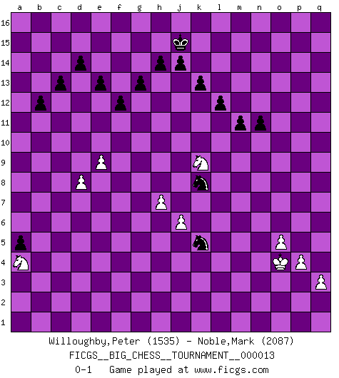 Last move : 0-1 2007 December 26 12:18:0 [Event "FICGS__BIG_CHESS__TOURNAMENT__000013"] [Site "FICGS"] [Date "2007.10.07"] [Round "1"] [White "Willoughby,Peter"] [Black "Noble,Mark"] [Result "0-1"] [WhiteElo "1535"] [BlackElo "2087"] 1.g2-g4 e15-e13 2.h1-d5 p16-o14 3.d2-d4 j15-k13 4.e2-e4 h16-o10 5.m2-m4 o10-f2 6.g1-f3 f2-o10 7.o2-o4 b16-c14 8.b1-c3 f16-b12 9.f1-c4 m15-m13 10.p1-q3 d15-d14 11.n2-n4 h15-j13 12.l1-m2 k16-h15 13.m2-b12 c14-b12 14.o1-g8 l16-q11 15.j2-k4 n15-n14 16.m1-m3 o16-h10 17.c1-h6 b12-c14 18.f3-h4 c16-h11 19.m3-p3 q16-p16 20.e1-f1 f15-f13 21.g8-f9 h11-f9 22.f1-f9 f13-f12 23.f9-f10 o10-l13 24.a1-f1 g15-g13 25.p3-p5 g16-f14 26.h6-f8 h10-f8 27.f10-f8 j16-j15 28.q1-o1 e16-e15 29.o1-o3 q11-o13 30.o3-p3 o13-p14 31.c4-d3 o14-n12 32.f1-f6 c14-d12 33.p5-e5 m16-m14 34.f6-d6 c15-c13 35.f8-b8 b15-b13 36.h4-j6 a15-a13 37.j6-h8 a13-a12 38.l2-l3 b13-b12 39.a2-a4 a12-a11 40.p3-p5 m14-l14 41.d3-b5 a16-m16 42.o4-o5 n12-l11 43.h2-j4 f14-h13 44.a4-a5 h13-j11 45.k4-j6 l13-o10 46.b2-b4 o10-e1 47.j1-j2 e1-c3 48.b5-d3 c3-d2 49.k1-h2 l14-l12 50.d5-c4 m16-m14 51.j2-k3 m14-k14 52.q3-o4 k13-h12 53.k3-l2 l11-k9 54.h8-k9 j11-k9 55.h2-f3 d2-f2 56.o4-m3 p16-m16 57.f3-h4 m16-m14 58.e5-f5 f2-d2 59.g4-g5 m14-l14 60.h4-f3 d2-j2 61.j6-k4 j2-q9 62.q2-q3 k9-l7 63.f5-f6 l7-k5 64.f6-k6 k5-m4 65.l2-m2 m4-k3 66.m2-n3 k3-j5 67.k6-k14 h15-k14 68.n3-o4 j5-l4 69.k4-m5 j13-k11 70.e4-e5 k14-h13 71.j4-k6 l4-k6 72.d6-k6 h13-g11 73.d3-p14 q15-p14 74.c4-a6 q9-j9 75.o4-p4 e15-e16 76.p5-p8 e16-q16 77.b8-j8 j9-f9 78.a6-j6 f9-j6 79.j8-j6 q16-q12 80.k6-q6 l12-o12 81.p8-q8 l14-l12 82.c2-c4 p14-p13 83.m3-n5 o15-o14 84.q8-q12 o12-q12 85.q6-n6 n14-n13 86.d4-d5 l15-l14 87.e5-e6 k15-k13 88.c4-c5 l12-n12 89.n5-p6 n12-n6 90.j6-n6 q12-n12 91.m5-n7 k11-l9 92.n6-l6 g11-j10 93.p4-o4 l14-l13 94.f3-h4 l13-l12 95.h4-k5 m13-m12 96.k5-l7 n12-n11 97.p2-p4 j10-k8 98.l6-n6 h12-j10 99.p6-q8 k8-m7 100.k2-k4 j10-k8 101.q8-o9 n11-q11 102.o4-p3 q11-b11 103.e6-e7 b11-b4 104.j3-j4 b4-h4 105.n6-h6 h4-h6 106.g5-h6 d12-f11 107.l3-l4 f11-e9 108.j4-j5 e9-d7 109.c5-c6 d7-f6 110.d5-d6 k8-l6 111.n7-l6 f6-e4 112.d6-d7 e4-g5 113.h3-h4 g5-f3 114.h4-h5 f3-e5 115.o9-p11 e5-c6 116.p11-o13 c6-a5 117.o13-p15 a5-c6 118.e7-e8 a11-a10 119.l7-j6 a10-a9 120.j6-g5 a9-a8 121.g5-e6 a8-a7 122.e6-c5 c6-b8 123.d7-d8 a7-a6 124.c5-a4 a6-a5 125.l6-j7 b8-d7 126.j7-g6 d7-f6 127.e8-e9 f6-h5 128.k4-k5 h5-j3 129.p15-n16 j3-l4 130.j5-j6 l4-m6 131.n16-o14 m6-n4 132.p3-o4 n4-m6 133.g6-j7 l9-j8 134.h6-h7 j8-l7 135.o14-n12 m6-k5 136.j7-k5 l7-k5 137.n12-p13 m12-m11 138.p13-o11 n13-n12 139.o11-m10 n12-n11 140.m10-k9 m7-k8 0-1 Follow this game move after move (download)Chess is like life. (Boris Spassky) Karpov ist ein Museumsstück. (Garry Kasparov) Si tu oponente no puede hacer nada activo, entonces no apures la posición; En vez de eso, dejalo estar sentado ahí, sufriendo y rogandote por un empate. (Jeremy Silman) La tactique, c'est ce que vous faites quand il y a quelque chose à faire; la stratégie, c'est ce que vous faites quand il n'y a rien à faire. (Savielli Tartacower) Life is verb, not a noun. (Charlotte Perkins Gilman)