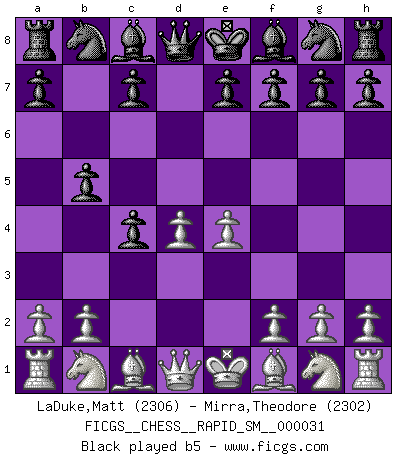 Last move : 1/2-1/2 2025 November 18 0:28:42 [Event "FICGS__CHESS__RAPID_SM__000031"] [Site "FICGS"] [Date "2025.08.22"] [Round "1"] [White "LaDuke,Matt"] [Black "Mirra,Theodore"] [Result "1/2-1/2"] [WhiteElo "2306"] [BlackElo "2302"] 1.d4 d5 2.c4 dxc4 3.e4 b5 4.a4 c6 5.axb5 cxb5 6.Nc3 Qb6 7.b3 e6 8.bxc4 Bb4 9.Bd2 bxc4 10.Bxc4 Ne7 11.Nge2 O-O 12.O-O a5 13.Na4 Qc6 14.Bd3 Nd7 15.Bf4 e5 16.Bg3 Qd6 17.dxe5 Nxe5 18.Bb5 Qb8 19.Nec3 f6 20.Qe2 Qa7 21.Kh1 Ba6 22.Rfd1 Nf7 23.h3 Qb7 24.Qc4 Bxb5 25.Nxb5 Rad8 26.Bd6 Bxd6 27.Rxd6 Rc8 28.Nc5 Ng6 29.Rxa5 Qb8 30.g3 Kh8 31.Rda6 Qe5 32.Nd4 Qh5 33.h4 Qd1+ 34.Kg2 Nfe5 35.Qe2 Qxd4 36.Ne6 Qd7 37.Nxf8 Nxf8 38.Ra8 Qb7 39.Rxc8 Qxc8 40.Qd1 Nc6 41.Rc5 Qe6 42.Qd5 Ne7 43.Qb7 Kg8 44.Ra5 Nfg6 45.Qb1 Kf8 46.f4 Nxf4+ 47.gxf4 Qg4+ 48.Kf2 Qxf4+ 49.Ke2 Qxh4 50.Ra8+ Kf7 51.Ra7 Qh2+ 52.Kd3 Qd6+ 53.Ke2 Qh2+ 54.Kd3 Qd6+ 55.Kc4 Qc6+ 56.Kd3 1/2-1/2 Follow this game move after move (download)Chess books should be used as we use glasses: to assist the sight, although some players make use of them as if they thought they conferred sight. (Jose Raul Capablanca) Wie bekannt hörte Morphy 1859 auf, Schach zu spielen. Seine Enttäuschung galt nicht so sehr dem Schach, wie den Schachspielern. (Robert James Fischer) La pasion por jugar al Ajedrez es una de las mas inexplicables en el mundo. (H.G. Wells) Les échecs sont plus proches de l'art de l'assassinat que de l'art de la guerre. (Arturo Perez-Reverte) I live to kill Traxler counterattack. (Ilmars Cirulis)
