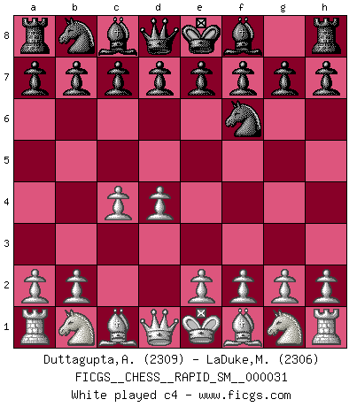 Last move : 1/2-1/2 2025 December 3 1:14:7 [Event "FICGS__CHESS__RAPID_SM__000031"] [Site "FICGS"] [Date "2025.08.22"] [Round "1"] [White "Duttagupta,Aniruddha"] [Black "LaDuke,Matt"] [Result "1/2-1/2"] [WhiteElo "2309"] [BlackElo "2306"] 1.d4 Nf6 2.c4 e6 3.Nc3 Bb4 4.f3 c5 5.d5 b5 6.e4 d6 7.Nge2 bxc4 8.Nf4 g5 9.Nfe2 exd5 10.exd5 Qe7 11.Bxg5 Bxc3+ 12.bxc3 Nbd7 13.Qd2 Rg8 14.h4 Ne5 15.Kf2 h6 16.Bxh6 Nd3+ 17.Kg1 Rb8 18.Nd4 cxd4 19.Bxd3 dxc3 20.Qxc3 Nxd5 21.Qd4 cxd3 22.Qxd5 Qe5 23.Qxe5+ dxe5 24.Rd1 Rb2 25.Rh2 Rg6 26.Be3 Re2 27.h5 Rg8 28.Bh6 Ba6 29.Rd2 e4 30.fxe4 Rg4 31.Rxe2 dxe2 32.Kf2 Rxe4 33.Bd2 e1Q+ 34.Bxe1 Re2+ 35.Kf1 Re6 36.Kf2 Re2+ 37.Kf1 1/2-1/2 Follow this game move after move (download)All I want to do, ever, is just play Chess. (Bobby Fischer) Fischer ist das größte Genie, das je vom Schachhimmel heruntergestiegen ist. (Mikhail Nekhemyevich Tal) Para mi, el Ajedrez es la vida y cada partida es como una nueva vida. Todo jugador de Ajedrez suele vivir muchas vidas durante su vida. (Eduard Gufeld) À la honte des hommes, on sait que les lois du jeu sont les seules qui soient partout justes, claires, inviolables et exécutées. Pourquoi l'Indien qui a donné les règles du jeu d'échecs est-il obéi de bon gré dans toute la terre, et que les décrétales des papes, par exemple, sont aujourd'hui un objet d'horreur et de mépris ? C'est que l'inventeur des échecs combina tout avec justesse pour la satisfaction des joueurs, et que les papes, dans leurs décrétales, n'eurent en vue que leur seul avantage. L'Indien voulut exercer également l'esprit des hommes et leur donner du plaisir; les papes ont voulu abrutir l'esprit des hommes. Voltaire (Dictionnaire philosophique / Garnier 1967) Inventor: A person who makes an ingenious arrangement of wheels, levers and springs, and believes it civilization. (Ambrose Bierce, The Devil's Dictionary)