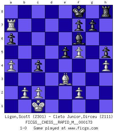 Last move : 1-0 2025 August 25 21:5:29 [Event "FICGS__CHESS__RAPID_M__000173"] [Site "FICGS"] [Date "2025.08.23"] [Round "1"] [White "Ligon,Scott"] [Black "Cleto Junior,Dirceu"] [Result "1-0"] [WhiteElo "2301"] [BlackElo "2111"] 1.e4 c5 2.Nf3 d6 3.d4 cxd4 4.Nxd4 Nf6 5.Nc3 e6 6.g4 h6 7.Rg1 Be7 8.Be3 a6 9.h4 d5 10.exd5 Nxd5 11.Nxd5 Qxd5 12.Qd2 e5 13.Bg2 Qc4 14.Nf5 Bxf5 15.Bd5 Qc7 16.gxf5 Bf6 17.O-O-O Nc6 18.Rg4 Rd8 19.Qc3 Kf8 20.Qc4 Rc8 21.Bxc6 Qxc6 22.Qxc6 Rxc6 23.Rd7 h5 24.Rb4 b5 25.a4 Rc4 26.Rxc4 bxc4 27.Ra7 1-0 Follow this game move after move (download)Chess is like war on a board. (Bobby Fischer) Ich kämpfe solange mein Gegner einen Fehler machen kann. (Emanuel Lasker) El Ajedrez es realmente noventa y nueve por ciento calculación. (Soltis) Horreur, mais aussi harmonie suprême : qu'y avait-il en effet au monde en dehors des échecs ? Le brouillard, l'inconnu, le non-être... (Vladimir Nabokov) Employ the attack like tactic of defense. (Chinese proverb)