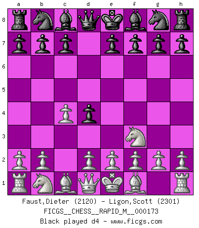 Last move : 1/2-1/2 2025 October 29 10:19:54 [Event "FICGS__CHESS__RAPID_M__000173"] [Site "FICGS"] [Date "2025.08.23"] [Round "1"] [White "Faust,Dieter"] [Black "Ligon,Scott"] [Result "1/2-1/2"] [WhiteElo "2120"] [BlackElo "2301"] 1.Nf3 d5 2.c4 d4 3.b4 c5 4.e3 Nf6 5.bxc5 Nc6 6.exd4 Nxd4 7.Be2 e5 8.Ba3 Ne4 9.Nc3 Bxc5 10.Nxe4 Bxa3 11.Nxd4 Qxd4 12.Qa4+ Bd7 13.Qxa3 Qxe4 14.Qe3 Qxe3 15.fxe3 e4 16.Rb1 O-O-O 17.g4 f6 18.Rf1 Rhe8 19.Rb3 Re6 20.Rf4 Bc6 21.h4 Kc7 22.Rf2 Re5 23.Ra3 a6 24.Kd1 Rd6 25.h5 Rg5 26.Rf4 Kd8 27.Kc2 Ke7 28.Rf2 Bd7 29.Rf4 Re5 30.Rf2 a5 31.Rf1 Be8 32.Kc3 a4 33.Kc2 Bc6 34.Rf2 g5 35.hxg6 hxg6 36.Rc3 Kf7 37.Kd1 Kg7 38.Rh2 Be8 39.Rc1 Rb6 40.Kc2 Bf7 41.Kc3 Re7 42.Rf2 Kh6 43.Rh1+ Kg7 44.Rc1 Kh6 1/2-1/2 Follow this game move after move (download)Good offense and good defense both begin with good development. (Bruce A. Moon) Ich habe Kasparov in Rente geschickt. (Veselin Topalov) Entre mas años cumplo, mas valoro los Peones. (Keres) Roi des jeux et jeu des rois, les échecs portent en eux un sentiment d'infini. Ils donnent à celui qui s'est efforcé d'en approfondir les arcanes l'impression de n'être pas à la mesure de l'homme; en fait, ils constituent un résumé de l'univers, un microcosme, et figurent cette grande échelle qui, dans les plans de la lumière descend jusqu'à la matière, qui des abîmes insondables remonte jusqu'en l'infini de Dieu. (Pyrame) Unless I accept my faults I will most certainly doubt my virtues. (Hugh Prather)