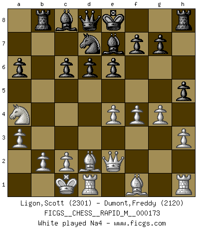 Last move : 1-0 2025 November 11 17:28:33 [Event "FICGS__CHESS__RAPID_M__000173"] [Site "FICGS"] [Date "2025.08.23"] [Round "1"] [White "Ligon,Scott"] [Black "Dumont,Freddy"] [Result "1-0"] [WhiteElo "2301"] [BlackElo "2120"] 1.e4 c5 2.Nf3 d6 3.d4 cxd4 4.Nxd4 Nf6 5.Nc3 a6 6.Be3 e6 7.a3 Be7 8.Qe2 h5 9.O-O-O Ng4 10.Bd2 Nc6 11.Nxc6 bxc6 12.h3 Ne5 13.f4 Nd7 14.g4 Rb8 15.Na4 hxg4 16.Qg2 gxh3 17.Rxh3 Rxh3 18.Qxh3 g6 19.Bc3 Nf8 20.Qe3 Qc7 21.Be2 c5 22.b3 Bb7 23.Nb2 Qc6 24.Bd3 f5 25.exf5 gxf5 26.Rg1 Qf3 27.Qd2 Bd5 28.Bf1 Rb6 29.Kb1 Qh5 30.Ka2 Qh7 31.Nc4 Bxc4 32.Bxc4 d5 33.Be2 Qh3 34.Be5 c4 35.Bd1 Bd6 36.Rg7 Nd7 37.Rg8+ Ke7 38.b4 Bxe5 39.fxe5 Qh4 40.Qe3 d4 41.Rg7+ Kd8 42.Qg1 c3 43.Bf3 1-0 Follow this game move after move (download)Adequate compensation for a sacrifice is having a sound combination leading to a winning position; adequate compensation for a blunder is having your opponent snatch defeat from the jaws of victory. (Bruce A. Moon) Kasparov stellt für gewöhnlich die Regeln auf und bricht sie dann selbst wieder. (Alexej Shirov) La captura del Rey enemigo es la finalidad pero no el primer objetivo de la partida. (William Steinitz) Le jeu d'échecs est comme rejeté hors du temps. (Antoine de Saint-Exupéry) Opportunities multiply as they are seized. (Sun Tzu)
