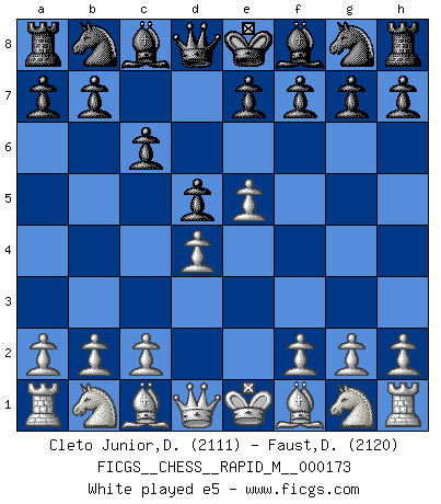 Last move : 1/2-1/2 2025 September 23 11:45:39 [Event "FICGS__CHESS__RAPID_M__000173"] [Site "FICGS"] [Date "2025.08.23"] [Round "1"] [White "Cleto Junior,Dirceu"] [Black "Faust,Dieter"] [Result "1/2-1/2"] [WhiteElo "2111"] [BlackElo "2120"] 1.e4 c6 2.d4 d5 3.e5 Bf5 4.Nf3 h6 5.Nh4 Bh7 6.e6 Qd6 7.exf7+ Kxf7 8.Bd3 Bxd3 9.Qxd3 Qf6 10.Qg3 Nd7 11.O-O e6 12.Re1 Rc8 13.Re3 Ne7 14.Rf3 Nf5 15.Qh3 Qxd4 16.Nc3 Nf6 17.Nxf5 exf5 18.Qxf5 Re8 19.Be3 Qe5 20.Qxe5 Rxe5 21.Bxa7 Bd6 22.Bd4 Re6 23.a4 g5 24.Ne2 g4 25.Re3 Rhe8 26.Rxe6 Rxe6 27.Be3 h5 28.g3 Re8 29.Rd1 Ke6 30.Rd3 Kd7 31.Kf1 Ne4 32.b3 Rf8 33.Kg2 Bc5 34.Bxc5 1/2-1/2 Follow this game move after move (download)Castle early and often. (Rob Sillars) Der Schachmeister von Heute braucht Courage, einen Killerinstinkt, Ausdauer und Arroganz. (Larry Evans) El Ajedrez es un terrible juego. Si no controlas el centro, tu oponente tiene una posición mas holgada. Si tienes control del centro, ¡entonces realmente tu tienes algo de que preocuparte!. (Siegbert Tarrasch) Les Echecs sont affaire de jugement sensible. Savoir quand frapper et quand esquiver. (Fischer) Warrior pose battles inner weakness and wins focus. You see that there is no war within you. You're on your own side, and you are your own strength. (Terri Guillemets)