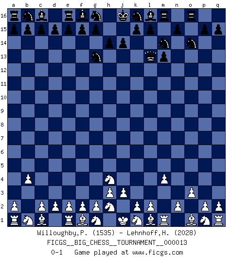 Last move : 0-1 2007 October 10 10:9:2 [Event "FICGS__BIG_CHESS__TOURNAMENT__000013"] [Site "FICGS"] [Date "2007.10.07"] [Round "1"] [White "Willoughby,Peter"] [Black "Lehnhoff,Heinz-Georg"] [Result "0-1"] [WhiteElo "1535"] [BlackElo "2028"] 1.j2-h4 m15-m13 2.h1-o7 h15-g13 3.o7-o15 p16-o14 4.m2-m4 j15-k13 5.b2-b4 k13-m14 6.o15-o16 q16-o16 7.o2-o3 h16-l13 0-1 Follow this game move after move (download)You need not play well - just help your opponent to play badly. (Genrikh Chepukaitis) Offensichtlich kennt Kasparow nichts anderes als Schach, und ich könnte 500 weitere Spieler dieser Sorte benennen. (Judith Polgar) El Ajedrez detiene a su maestro dentro de sus propios vínculos, encadenando la mente y el cerebro, por lo que la libertad interior del mas fuerte debe sufrir. (Albert Einstein) Ce qui caractérise les parties de combat, c'est que si le défenseur a constamment de difficiles problèmes à résoudre, l'attaquant doit chercher sans relâche de nouvelles possibilités d'attaque. (Koblentz) Once you start thinking you have nothing left to learn, you have everything to learn. (Steve Badget)