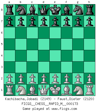 Last move : 0-1 2025 October 10 16:2:51 [Event "FICGS__CHESS__RAPID_M__000173"] [Site "FICGS"] [Date "2025.08.23"] [Round "1"] [White "Kachibacha,Jobadi"] [Black "Faust,Dieter"] [Result "0-1"] [WhiteElo "2149"] [BlackElo "2120"] 1.e4 c6 2.d4 d5 3.Nc3 dxe4 4.Nxe4 Bf5 5.Ng3 Bg6 6.h4 h6 7.Nf3 Nd7 8.h5 Bh7 9.Bd3 Bxd3 10.Qxd3 e6 11.Bd2 Ngf6 12.O-O-O Be7 0-1 This chess game has been lost on time (started : 2025.08.23 13:40:33) Follow this game move after move (download)Chess, like love, is infectious at any age. (Flohr) Kostenjuk hat keinen Sexappeal. (Loek van Wely) El Ajedrez es realmente noventa y nueve por ciento calculación. (Soltis) Je fais ceci parce que dans cinquante coups j'obtiendrai cela; je m'appelle Mikhail Moisevitch Botvinnik. (Botvinnik) All men can see these tactics whereby I conquer, but what none can see is the strategy out of which victory is evolved. (Sun Tzu)