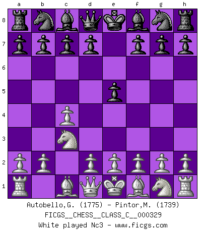 Last move : 1-0 2026 January 2 21:33:15 [Event "FICGS__CHESS__CLASS_C__000329"] [Site "FICGS"] [Date "2025.08.23"] [Round "1"] [White "Autobello,Giovanni"] [Black "Pintor,Manuel"] [Result "1-0"] [WhiteElo "1775"] [BlackElo "1739"] 1.c4 e5 2.Nc3 Bc5 3.Nf3 d6 4.g3 Nf6 5.Bg2 O-O 6.O-O Bf5 7.d3 Nc6 8.a3 h6 9.b4 Bd4 10.Bb2 Qd7 11.Nxd4 Nxd4 12.Bxb7 Rae8 13.e4 Bg4 14.Qa4 Qxa4 15.Nxa4 Bh3 16.Bxd4 Bxf1 17.Bxe5 dxe5 18.Rxf1 Rd8 19.Nc5 Nd7 20.Na6 c5 21.bxc5 Nb8 22.Nxb8 Rxb8 23.c6 g5 24.Rb1 Rfc8 25.Rb5 Rc7 26.Rxe5 R8xb7 27.cxb7 Rxb7 28.Rd5 g4 29.c5 f6 30.c6 Rc7 31.Rc5 Kf7 32.d4 Kg6 33.d5 1-0 Follow this game move after move (download)War is the child of passion, passion is the child of narcissism and narcissism is the child. (...) Another game ? (Thibault de Vassal) Obwohl ich alt bin, darf mir niemand den Finger in den Mund stecken, sonst beisse ich. (Wilhelm Steinitz) Todavía soy una víctima del Ajedrez. Tiene toda la belleza del arte y mucho mas. No puede ser comercializado. El Ajedrez es mas puro que el arte en su posición social. (Marcel Duchamp) J'apprécie les joueurs d'est-indienne, c'est grâce à eux que je nourris ma famille depuis tant d'années. (Petrosian) I just play for fun. (Anna Kournikova)
