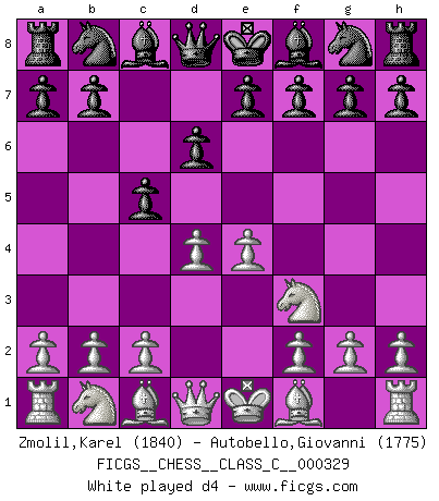 Last move : f3 2026 January 20 12:52:13 White clock - 95 days 05:35:28 Black clock - 6 days 11:58:56 [Event "FICGS__CHESS__CLASS_C__000329"] [Site "FICGS"] [Date "2025.08.23"] [Round "1"] [White "Zmolil,Karel"] [Black "Autobello,Giovanni"] [Result "*"] [WhiteElo "1840"] [BlackElo "1775"] 1.e4 c5 2.Nf3 d6 3.d4 cxd4 4.Nxd4 Nf6 5.Nc3 a6 6.h3 Nc6 7.Be3 e5 8.Nf3 Be6 9.Ng5 Be7 10.Nxe6 fxe6 11.a3 d5 12.exd5 exd5 13.Bg5 d4 14.Ne2 O-O 15.Ng3 h6 16.Bd2 Rc8 17.Be2 b5 18.Bd3 Qc7 19.O-O Na5 20.Ne4 Nc4 21.Nxf6+ Rxf6 22.Bc1 Rcf8 23.b3 Nb6 24.Bd2 Nd5 25.Qe1 Nf4 26.Be4 Bd6 27.f3 * Follow this game move after move (download)No price is too great for the scalp of the enemy King. (Koblentz) Zu meiner Zeit war ein 20 jähriger ein junger Spieler, heute ist er ein Veteran. (Garry Kasparov) La caracteristica mas importante en la posición del Ajedrez es la actividad de las piezas. Esto es absolutamente fundamental en todas las fases del juego: Apertura, Juego Medio y especialmente Finales. La limitación primordial en la actividad de una pieza, es la estructuración de los Peones. (Michael Stean) La vérité est comme le meilleur coup aux échecs : elle existe, mais il faut la chercher. (Arturo Perez-Reverte) When you've done things right people won't know you've done anything at all. (Futurama)