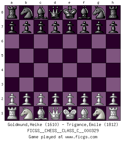 Last move : 1-0 2025 November 6 20:14:14 [Event "FICGS__CHESS__CLASS_C__000329"] [Site "FICGS"] [Date "2025.08.23"] [Round "1"] [White "Goldmund,Heike"] [Black "Trigance,Emile"] [Result "1-0"] [WhiteElo "1610"] [BlackElo "1812"] 1.b4 c6 2.e3 b5 3.c4 a6 4.Nf3 e6 5.Bb2 1-0 This chess game has been lost on time (started : 2025.08.23 14:22:6) Follow this game move after move (download)I thought the most common mistake [in chess] was the first one: Learning the game :P (Garvin Gray, FICGS forum) Nach Morphy wurde nichts neues mehr in der Behandlung offener Positionen gefunden. (Mikhail Moiseyevich Botvinik) Las combinaciones han sido siempre el aspecto más intrigante del Ajedrez. Los Maestros las buscan, el público las aplauden, los críticos las alaban. La razón se debe a que las combinaciones hacen posible que el Ajedrez sea más que un ejercicio matemático con una carencia de vida. Ellas son la poesía del juego, son del Ajedrez lo que la melodía es de la música. Ellas representan el triunfo de la mente sobre la materia. (Reuben Fine) J'ai vu le vaincu d'Echecs jouer des années durant dans l'espoir de la fête de la victoire. Car tu es plus riche de ce qu'elle existe si même elle n'est point pour toi. Ainsi de la perle du fond des mers. (Antoine de Saint-Exupéry) A computer lets you make more mistakes faster than any invention in human history - with the possible exceptions of handguns and tequila. (Mitch Ratcliffe)