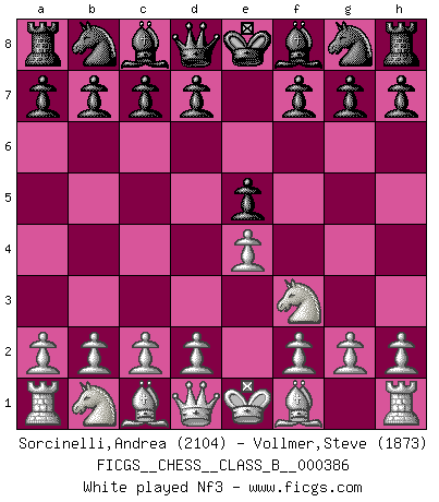 Last move : 1-0 2025 September 26 9:13:21 [Event "FICGS__CHESS__CLASS_B__000386"] [Site "FICGS"] [Date "2025.08.24"] [Round "1"] [White "Sorcinelli,Andrea"] [Black "Vollmer,Steve"] [Result "1-0"] [WhiteElo "2104"] [BlackElo "1873"] 1.e4 e5 2.Nf3 Nc6 3.Bb5 Nf6 4.O-O d6 5.c3 a6 6.Ba4 Be7 7.Re1 O-O 8.h3 b5 9.Bb3 Bb7 10.d4 exd4 11.cxd4 Na5 12.Bc2 c5 13.d5 Nc4 14.Nbd2 Nxd2 15.Bxd2 Qd7 16.a4 Rfb8 17.b4 Qd8 18.bxc5 dxc5 19.Bf4 Rc8 20.d6 Bf8 21.e5 Nd5 22.Bxh7+ Kxh7 23.Ng5+ Qxg5 24.Bxg5 Nc3 25.Qd3+ 1-0 Follow this game move after move (download)Excellence at Chess is one mark of a scheming mind. (Sir Arthur Conan Doyle) Das Schachspiel hat wie die Liebe, die Musik, die Fähigkeit, den Menschen glücklich zu machen. Ich habe ein leises Gefühl des Bedauerns für jeden, der das Schachspiel nicht kennt, so wie ich jeden bedaure, der die Liebe nicht kennt. (Siegbert Tarrasch) Coloca el contenido del tablero de Ajedrez en un sombrero, agita las piezas vigorosamente, derrámalas en el tablero desde una altura de medio metro y así obtienes el estilo de Wilhelm Steinitz. (H. E. Bird) L'attaque fait le spectacle, la défense gagne les matchs. (Dicton footballistique) The ego is not master in its own house. (Sigmund Freud)