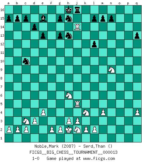Last move : 1-0 2007 December 2 13:57:21 [Event "FICGS__BIG_CHESS__TOURNAMENT__000013"] [Site "FICGS"] [Date "2007.10.07"] [Round "1"] [White "Noble,Mark"] [Black "Serd,Than"] [Result "1-0"] [WhiteElo "2087"] [BlackElo ""] 1.j2-k4 k16-l14 2.h1-o7 p16-o14 3.o7-f15 g16-f14 4.h2-g4 k15-k13 5.f15-p6 j15-h13 6.m2-m4 q15-q13 7.e2-e4 q16-q14 8.f1-c4 q14-p14 9.p6-c6 b16-c14 10.c4-o15 p14-p12 11.o15-g8 h16-k14 12.d2-d3 l16-k15 13.c1-h6 d15-d14 14.b1-c3 j14-j13 15.p1-o3 j13-j12 16.l1-p5 c16-p4 17.q2-q4 e15-e13 18.n2-n3 p15-p14 19.o1-j6 p12-l12 20.g8-l12 k13-l12 21.k1-h2 h15-g13 22.g1-j2 p4-o3 23.p2-o3 f16-e15 24.q1-p1 l14-j13 25.p5-g13 h14-g13 26.p1-p14 k14-n14 27.m1-p1 n14-o13 28.c6-j12 e16-h16 29.p14-p13 o13-o3 30.p13-j13 j16-k16 31.h2-k3 o3-o2 32.j1-h2 h16-j16 33.e1-o1 j16-j13 34.j12-j13 o2-n3 35.a1-n1 n3-q3 36.n1-n8 q3-f13 37.n8-k8 f13-j16 38.o1-o13 j16-j13 39.o13-j13 a16-j16 40.j13-k13 j16-j15 41.p1-p7 o16-q14 42.k8-k5 q14-h6 43.g4-h6 h13-k14 44.p7-k7 f14-h15 45.j6-d11 k15-j14 46.k13-k8 o14-m13 47.k3-l5 k16-j16 48.k5-j5 j16-h16 49.k7-j7 m16-j16 50.k8-j8 m13-k12 51.l5-m7 k14-h13 52.m7-n9 c14-b12 53.d11-e10 b12-c10 54.e10-h13 k12-h13 55.j8-j14 j15-j14 56.j7-j14 1-0 Follow this game move after move (download)Chess is life. (Bobby Fischer) Es liegt in der Natur, vernüftig zu denken und unlogisch zu handeln. (Anatole France) El Ajedrez es un invernadero donde los frutos del carácter pueden madurar mas completamente que en la vida. (Edward Morgan Foster) Si rien de grave n'est détecté lors de l'analyse d'une position, on joue alors le coup. Seconde règle de Blumenfeld. We cannot be sure of having something to live for unless we are willing to die for it. (Ernesto Che Guevara)