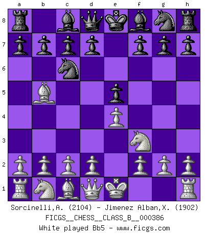 Last move : 1/2-1/2 2026 January 1 17:38:7 [Event "FICGS__CHESS__CLASS_B__000386"] [Site "FICGS"] [Date "2025.08.24"] [Round "1"] [White "Sorcinelli,Andrea"] [Black "Jimenez Alban,Xavier Miguel"] [Result "1/2-1/2"] [WhiteElo "2104"] [BlackElo "1902"] 1.e4 e5 2.Nf3 Nc6 3.Bb5 Nf6 4.O-O Nxe4 5.Re1 Nd6 6.a4 Be7 7.Nc3 a6 8.Bf1 e4 9.Nxe4 Nxe4 10.Rxe4 d5 11.Re1 Bg4 12.h3 Bh5 13.c3 d4 14.d3 O-O 15.Bd2 Bf6 16.g4 Bg6 17.Qb3 Rb8 18.Bf4 h5 19.Bg3 hxg4 20.hxg4 Qd7 21.Bh3 dxc3 22.bxc3 b5 23.axb5 Rxb5 24.Qc4 Bxd3 25.g5 Bxc4 26.Bxd7 Bxc3 27.Bxc6 Rc5 28.Bb7 Rb8 29.Bxa6 Bxe1 30.Rc1 1/2-1/2 Follow this game move after move (download)In blitz, the Knight is stronger than the Bishop. (Vlastimil Hort) Ich spiele ehrlich und spiele, um zu gewinnen. Wenn ich verliere nehme ich meine Medizin. (Robert James Fischer) El Ajedrez detiene a su maestro dentro de sus propios vínculos, encadenando la mente y el cerebro, por lo que la libertad interior del mas fuerte debe sufrir. (Albert Einstein) Il s'avisa de me proposer d'apprendre les échecs qu'il jouait un peu... me voilà forcené des échecs. J'achète un échiquier, je m'enferme dans ma chambre, j'y passe des jours et des nuits à vouloir apprendre par cur toutes les parties. (Jean-Jacques Rousseau, Confessions) In fact if nothing is done against this teddy bear, hereby I announce that I would quit chess, rapid chess, blitz chess, postal chess, email chess, server chess and correspondence chess I will then switch to a table game where teddy bears aren't going to be seen for a while, like Poker, or Roulette, all 18+ games. (Elmer Valderrama)