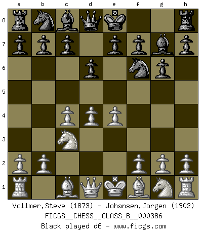 Last move : 1-0 2025 October 30 14:49:9 [Event "FICGS__CHESS__CLASS_B__000386"] [Site "FICGS"] [Date "2025.08.24"] [Round "1"] [White "Vollmer,Steve"] [Black "Johansen,Jorgen"] [Result "1-0"] [WhiteElo "1873"] [BlackElo "1902"] 1.d4 Nf6 2.c4 g6 3.Nc3 Bg7 4.e4 d6 5.f4 c5 6.dxc5 O-O 7.cxd6 1-0 This chess game has been lost on time (started : 2025.08.24 11:52:11) Follow this game move after move (download)The Pin is mightier than the sword. (Fred Reinfeld) Ich tröste mich mit dem Vergnügen, daß Schachfans, Zuschauer und Leser glücklich sind, wenn ein Großmeister etwas riskiert, statt nur Klötzchen zu schieben. (Mikhail Nekhemyevich Tal) Un jugador que trata de regresar una movida en el Ajedrez es un futuro carterista. (Richard Fenton) Le pion, dans sa simplicité, marche droit devant lui, mais lorsqu'il prend, il le fait obliquement? Ainsi l'homme, tant qu'il reste pauvre, marche dans la droiture et vit honnêtement, mais lorsqu'il recherche les honneurs, il flatte, se parjure et, par les voies obliques, cherche une position supérieure sur l'échiquier du monde. (Jean de Galles) Art is not a thing, it is a way. (Elbert Hubbard)