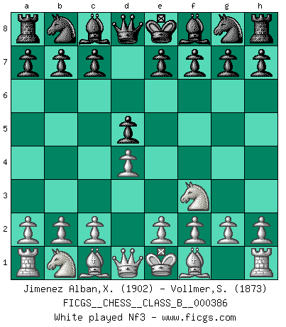 Last move : Bxa6 2026 January 15 15:18:52 White clock - 45 days 06:32:18 Black clock - 86 days 04:37:02 (54 days 00:47:39) [Event "FICGS__CHESS__CLASS_B__000386"] [Site "FICGS"] [Date "2025.08.24"] [Round "1"] [White "Jimenez Alban,Xavier Miguel"] [Black "Vollmer,Steve"] [Result "*"] [WhiteElo "1902"] [BlackElo "1873"] 1.d4 d5 2.Nf3 Nf6 3.Bf4 g6 4.e3 Bg7 5.Be2 O-O 6.O-O Nc6 7.h3 a6 8.Nbd2 Ne4 9.Nxe4 dxe4 10.Ng5 Bf5 11.g4 h6 12.Nxf7 Rxf7 13.gxf5 Rxf5 14.c3 b5 15.Qb3+ Kh7 16.Qe6 Qd5 17.Qxd5 Rxd5 18.Bxc7 Rc8 19.Bg3 e5 20.a4 exd4 21.cxd4 b4 22.Rfc1 R5d8 23.Bxa6 * Follow this game move after move (download)It is no time to be playing Chess when the house is on fire. (Italian Proverb) Charakterschwächen offenbaren sich normalerweise während einer Schachpartie. (Garry Kasparov) Debes de llevar a tu oponente hacia un profundo y obscuro bosque donde 2+2=5, y el camino que conduce a la salida es suficientemente ancho para solamente uno. (Mikhail Tal) Ce qui caractérise les parties de combat, c'est que si le défenseur a constamment de difficiles problèmes à résoudre, l'attaquant doit chercher sans relâche de nouvelles possibilités d'attaque. (Koblentz) Industry executives and analysts often mistakenly talk about strategy as if it were some kind of chess match. But in chess, you have just two opponents, each with identical resources, and with luck playing a minimal role. The real world is much more like a poker game, with multiple players trying to make the best of whatever hand fortune has dealt them. In our industry, Bill Gates owns the table until someone proves otherwise. (David Moschella, 'Computerworld')