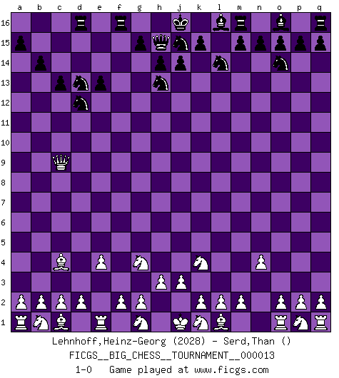 Last move : 1-0 2007 October 21 20:35:10 [Event "FICGS__BIG_CHESS__TOURNAMENT__000013"] [Site "FICGS"] [Date "2007.10.07"] [Round "1"] [White "Lehnhoff,Heinz-Georg"] [Black "Serd,Than"] [Result "1-0"] [WhiteElo "2028"] [BlackElo ""] 1.j2-k4 b15-b14 2.h1-o7 p16-o14 3.o7-f15 g16-f14 4.f15-l10 f14-h13 5.l10-l15 k16-l14 6.l15-c7 b16-c14 7.e2-e4 c16-a14 8.c7-d8 e15-e13 9.d8-d15 c14-d12 10.d15-a12 a14-b13 11.a12-a10 f16-b12 12.n2-n4 b13-o1 13.m1-o1 h15-f14 14.a10-b9 h16-h15 15.b9-b12 c15-c13 16.b12-c11 a16-d16 17.f1-c4 f14-d13 18.c11-c9 e16-f16 19.h2-g4 1-0 Follow this game move after move (download)What is the difference between chess and football? Everybody understands football, but nobody plays it. Everybody plays chess, but nobody understands it. Everything is relative. (Vladimir Kramnik) Ein typischer, sehr verbreiteter Gedankenschädling ist der, daß der betreffende Amateur von der Annanhme ausgeht, daß jeder einzelne Zug etwas zu leisten habe. (Aaron Nimzowitsch) El Ajedrez es un cuento de Hadas de las 1001 metidas de pata. (Savielly Tartakower) La menace est plus forte que l'exécution. (Aaron Nimzovitch) The question of whether computers can think is just like question of whether submarines can swim. (Edsger W. Dijkstra)