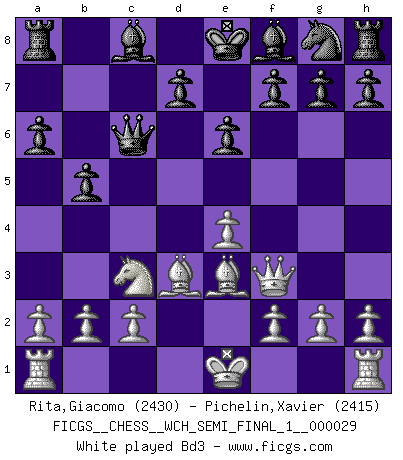 Last move : 1/2-1/2 2025 December 4 12:9:8 [Event "FICGS__CHESS__WCH_SEMI_FINAL_1__000029"] [Site "FICGS"] [Date "2025.08.30"] [Round "5"] [White "Rita,Giacomo"] [Black "Pichelin,Xavier"] [Result "1/2-1/2"] [WhiteElo "2430"] [BlackElo "2415"] 1.e4 c5 2.Nf3 e6 3.d4 cxd4 4.Nxd4 Nc6 5.Nc3 Qc7 6.Be3 a6 7.Qf3 b5 8.Nxc6 Qxc6 9.Bd3 h5 10.O-O-O Bb7 11.Rhe1 Nf6 12.Bd4 Be7 13.a3 Qc7 14.Kb1 Rb8 15.Qe3 Bc6 16.Qg5 Rg8 17.e5 Ne4 18.Qxh5 Nxc3+ 19.Bxc3 b4 20.Bxb4 Bxb4 21.axb4 Rxb4 22.c3 Rb8 23.Re2 g6 24.Qg4 Bd5 25.Kc1 Qa5 26.Bb1 Bb3 27.Rd6 Rh8 28.h3 Bd5 29.Rd2 Bc6 30.Qg3 Qb5 31.f3 Qf1+ 32.Rd1 Qb5 33.R1d2 Qf1+ 34.Rd1 Qb5 35.R6d2 a5 36.Ba2 Qa4 37.Kb1 Qh4 38.Qg4 Qxg4 39.hxg4 Rb5 40.Re1 Ke7 41.Rde2 a4 42.c4 Rb7 43.Kc2 f6 44.Kc3 f5 45.gxf5 gxf5 46.Rf1 Rh2 47.Rd2 Kf7 48.b4 axb3 49.Bxb3 Kg6 50.Rg1 Ra7 51.Bd1 Kf7 52.Bb3 Rh8 53.Rgd1 Rh4 54.Kb4 Rb7+ 55.Kc3 Ra7 1/2-1/2 Follow this game move after move (download)If a ruler does not understand Chess, how can he rule over a kingdom ? (King Khusros II) Die Idee von Capablanca, Schach als Fach in den Schulen zu lehren, ist großartig. (Fidel Castro) Debemos de asegurarnos de que el Ajedrez no se convierta en un lenguaje muerto, muy interesante, pero solo para un grupo muy pequeño. (Sytze Faber) D'abord les bases : Jouez et étudiez, puis étudiez et jouez, ensuite jouez et étudiez, puis étudiez et jouez. Deuxièmement : Donnez toujours le meilleur de vous-même ! (Ken Smith) After growing wildly for years, the field of computing appears to be reaching its infancy. (John Pierce)