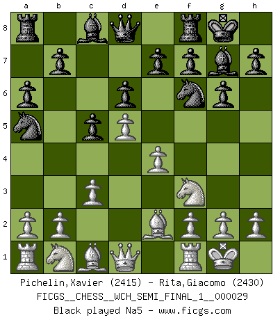 Last move : 1/2-1/2 2025 October 23 13:16:10 [Event "FICGS__CHESS__WCH_SEMI_FINAL_1__000029"] [Site "FICGS"] [Date "2025.08.30"] [Round "6"] [White "Pichelin,Xavier"] [Black "Rita,Giacomo"] [Result "1/2-1/2"] [WhiteElo "2415"] [BlackElo "2430"] 1.e4 c5 2.Nf3 d6 3.Be2 Nf6 4.c3 g6 5.O-O Bg7 6.Bb5+ Nc6 7.d4 O-O 8.d5 a6 9.Be2 Na5 10.b4 cxb4 11.cxb4 Nxe4 12.Nd4 Qb6 13.Nc2 Bxa1 14.Be3 Qc7 15.Nxa1 Nc4 16.Qc2 Bf5 17.Qxc4 Qxc4 18.Bxc4 Rfc8 19.Bb3 a5 20.g4 Bd7 21.f3 a4 22.Bc2 Nc3 23.Nxc3 Rxc3 24.Bd2 Rc4 25.Re1 Rd4 26.Bc3 Rc4 27.Bd2 Rd4 28.Bc3 1/2-1/2 Follow this game move after move (download)First-class players lose to second class players because second-class players sometimes play a first-class game. (Tarrasch) Ivan Sokolov treibt mich als Beifahrer an mit go Loeky go - . (Loek van Wely) Los problemas de Ajedrez exigen del compositor las mismas virtudes que caracterizan todo el arte de valor: originalidad, invención, concisión, armonía, complejidad e insinceridad explendida. (Vladimir Nabokov) Un journaliste : 'Vous préférez avoir une dame de plus sur l'échiquier ou au lit ?' Boris Spassky : 'Ca dépend de la position.' He who laughs last probably does not get the joke. (Unknown)