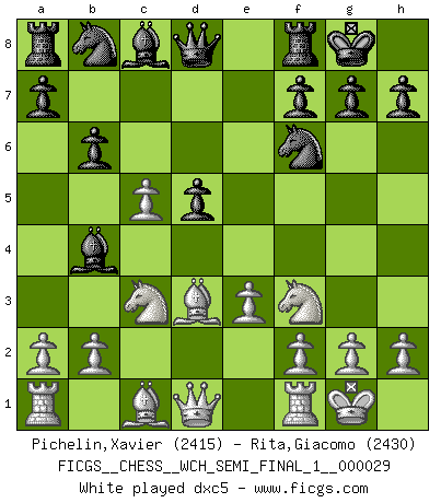 Last move : 1/2-1/2 2025 December 9 19:37:49 [Event "FICGS__CHESS__WCH_SEMI_FINAL_1__000029"] [Site "FICGS"] [Date "2025.08.30"] [Round "8"] [White "Pichelin,Xavier"] [Black "Rita,Giacomo"] [Result "1/2-1/2"] [WhiteElo "2415"] [BlackElo "2430"] 1.d4 Nf6 2.c4 e6 3.Nc3 Bb4 4.Nf3 b6 5.e3 O-O 6.Bd3 d5 7.cxd5 exd5 8.O-O c5 9.dxc5 bxc5 10.Na4 c4 11.Be2 Bd7 12.a3 Be7 13.Nc3 Be6 14.Nd4 Qc8 15.Nxe6 Qxe6 16.b3 cxb3 17.Qxb3 Nc6 18.Qa4 Rfd8 19.Nb5 Qd7 20.Bb2 Rab8 21.Ra2 Ne4 22.Qc2 Rbc8 23.Qd3 g6 24.h3 h5 25.Nd4 Ne5 26.Qb5 Nc4 27.Ba1 Qd6 28.Bd3 Ncd2 29.Rd1 Bh4 30.Bxe4 Nxe4 31.Qb4 Qc7 32.Rc2 a5 33.Qb2 Qe5 34.Rf1 Rc4 35.Nf3 Qxb2 36.Rxb2 Bf6 37.Rb5 Bxa1 38.Rxa1 Rc2 39.Nd4 Rxf2 40.Rxa5 h4 41.Nc6 Rd6 42.Nd4 Rd7 43.Rb5 Rc7 44.Kh2 Ng3 45.R5b1 Rc3 46.Kg1 Ne4 47.Re1 Rf6 48.Rec1 Rxe3 49.a4 Ng3 50.a5 Re4 51.Rc8+ Kg7 52.Nf3 Ra6 53.Rd8 Ne2+ 54.Kh2 Nd4 55.Rxd5 Nxf3+ 56.gxf3 Re2+ 57.Kg1 Rc6 58.a6 R6c2 1/2-1/2 Follow this game move after move (download)Chess is as much a mystery as women. (Purdy) Drei Punkte vor allen anderen ist wie einer, der im weißen Anzug posiert, während der Rest in Müllsäcke gekleidet dasteht. (Viktor Kortschnoi) Ayuda a tus piezas para que ellas te puedan ayudar. (Paul Morphy) Pour moi, les échecs ne sont pas un jeu mais un art. (Alexandre Alekhine) Difficult things take a long time, impossible things a little longer. (Author unknown)