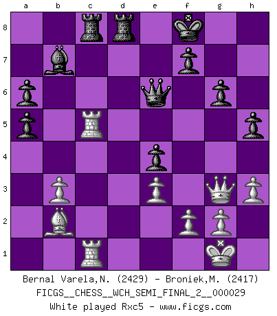 Last move : 1/2-1/2 2026 February 8 13:44:30 [Event "FICGS__CHESS__WCH_SEMI_FINAL_2__000029"] [Site "FICGS"] [Date "2025.08.30"] [Round "1"] [White "Bernal Varela,Nelson"] [Black "Broniek,Mariusz Maciej"] [Result "1/2-1/2"] [WhiteElo "2429"] [BlackElo "2417"] 1.e3 d5 2.c4 e6 3.Nf3 Nf6 4.Nc3 Bd6 5.d4 b6 6.Bd3 Bb7 7.b3 O-O 8.O-O Nbd7 9.Bb2 Re8 10.h3 a6 11.Re1 Ne4 12.Rc1 Qe7 13.a4 c5 14.cxd5 exd5 15.Bb1 Ndf6 16.a5 bxa5 17.Nxe4 Nxe4 18.dxc5 Bxc5 19.Nd4 g6 20.Re2 Rac8 21.Bxe4 dxe4 22.Rec2 Red8 23.Qg4 h5 24.Qg3 Kf8 25.Ne6+ Qxe6 26.Rxc5 Rxc5 27.Ba3 Kg8 28.Bxc5 Rc8 29.Rc3 Kg7 30.Bd4+ f6 31.Rxc8 Qxc8 32.Qd6 Qf8 33.Qf4 Qe7 34.g4 hxg4 35.hxg4 Qe6 36.g5 Kg8 37.gxf6 Qf5 38.f7+ Kf8 39.Qd6+ Kxf7 40.Bc5 g5 41.Qc7+ Kg8 42.Bd4 Kf8 43.Kf1 Qd5 44.Bc5+ Kg8 45.Bd4 Kf8 46.Bc5+ Kg8 47.Bd4 Kf8 1/2-1/2 Follow this game move after move (download)Life is a kind of Chess, with struggle, competition, good and ill events. (Benjamin Franklin) Man gibt nur Pakete auf. (Paul Keres) Una buena ofensiva y una buena defensa, comienzan ambas con un buen desarrollo. (Bruce A. Moon) Les sacrifices démontrent seulement que quelqu'un a gaffé. (Savielly Tartacover) Man with more than one clock never knows what time it is. (Chinese thought)