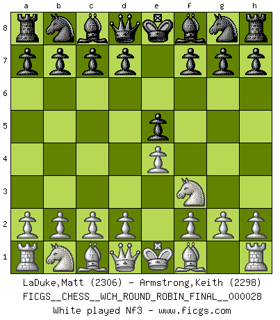 Last move : 1/2-1/2 2025 November 22 0:11:42 [Event "FICGS__CHESS__WCH_ROUND_ROBIN_FINAL__000028"] [Site "FICGS"] [Date "2025.08.31"] [Round "1"] [White "LaDuke,Matt"] [Black "Armstrong,Keith"] [Result "1/2-1/2"] [WhiteElo "2306"] [BlackElo "2298"] 1.e4 e5 2.Nf3 Nc6 3.Bb5 a6 4.Ba4 Nf6 5.O-O Nxe4 6.d4 b5 7.Bb3 d5 8.dxe5 Be6 9.c3 Be7 10.Nbd2 Nc5 11.Bc2 d4 12.Nb3 d3 13.Bb1 Nxb3 14.axb3 Bf5 15.Re1 O-O 16.b4 Qd7 17.h3 Rfd8 18.Bf4 a5 19.g4 Bg6 20.bxa5 Rxa5 21.Ba2 Rf8 22.e6 Qd8 23.exf7+ Kh8 24.b4 Ra4 25.Bd2 h6 26.Be6 Rxa1 27.Qxa1 Bxf7 28.Qa2 Be8 29.Bf5 Bf7 30.Be6 Be8 31.Bf5 Bf7 32.Be6 1/2-1/2 Follow this game move after move (download)Though most people love to look at the games of the great attacking masters, some of the most successful players in history have been the quiet positional players. They slowly grind you down by taking away your space, tying up your pieces, and leaving you with virtually nothing to do ! (Yasser Seirawan) Nicht daß Diemer aus Opportunismus Mitglied der NSDAP geworden wäre. Er war ein Fanatiker, in allem, was er tat. (Hans Ree) El Ajedrez es parte de una cultura y si una cultura esta en decadencia, entonces también el Ajedrez declinará. (Mikhail Botvinnik) Les échecs sont un jeu terrible. Si vous n'avez pas le centre, votre adversaire a une position plus libre. Par contre, si vous avez le centre, alors vous avez vraiment quelque chose pour laquelle vous inquiéter ! (Siegbert Tarrasch) Drag your thoughts away from your troubles... by the ears, by the heels, or any other way you can manage it. (Mark Twain)
