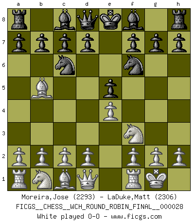 Last move : 1/2-1/2 2025 November 11 4:29:18 [Event "FICGS__CHESS__WCH_ROUND_ROBIN_FINAL__000028"] [Site "FICGS"] [Date "2025.08.31"] [Round "1"] [White "Moreira,Jose"] [Black "LaDuke,Matt"] [Result "1/2-1/2"] [WhiteElo "2293"] [BlackElo "2306"] 1.e4 e5 2.Nf3 Nc6 3.Bb5 Nf6 4.O-O Nxe4 5.Re1 Nd6 6.Nxe5 Nxe5 7.Rxe5+ Be7 8.Bf1 O-O 9.d4 Bf6 10.Re1 Re8 11.c3 Rxe1 12.Qxe1 Ne8 13.a4 a5 14.Bd3 d5 15.Bf4 g6 16.Nd2 Ng7 17.Nf3 Bf5 18.Bxf5 Nxf5 19.Qe2 Qd7 20.h3 c6 21.Ne5 Qe7 22.Re1 Re8 23.Qd2 Qd8 24.Nd3 Rxe1+ 25.Qxe1 h5 26.g3 Ng7 27.Kg2 Be7 28.g4 Ne6 29.Be5 hxg4 30.hxg4 Qd7 31.Qe3 f6 32.Bg3 b5 33.axb5 cxb5 34.Qh6 Qe8 35.Qe3 Qd7 36.Qh6 Qe8 37.Qe3 Qd7 1/2-1/2 Follow this game move after move (download)By playing at Chess then, we may learn: First: Foresight... Second: Circumspection... Third: Caution... And lastly, we learn by Chess the habit of not being discouraged by present bad appearances in the state of our affairs, the habit of hoping for a favorable chance, and that of persevering in the secrets of resources. (Benjamin Franklin) Alle Schachspieler sollten auch ein Hobby haben. (Savielly Grigorievitsch Tartakower) Cuando me preguntan: -¿Cual es el secreto que te hace hacer mejores movidas que tus oponentes?, Yo respondo: Me da gusto que me pregunten eso, porque, como veran, hay una simple razón. Yo pienso mis propias movidas y dejo a mi oponente que el piense las suyas. (Alexander Alekhine) Nous vivons dans un monde échiquéen : chaque jour qui passe est un défi à relever. (Philosophe Sasha) To send light into the darkness of men's hearts - such is the duty of the artist. (Schumann)