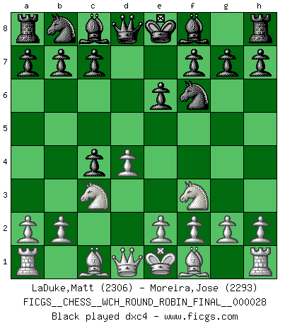 Last move : 1/2-1/2 2025 December 29 19:41:47 [Event "FICGS__CHESS__WCH_ROUND_ROBIN_FINAL__000028"] [Site "FICGS"] [Date "2025.08.31"] [Round "2"] [White "LaDuke,Matt"] [Black "Moreira,Jose"] [Result "1/2-1/2"] [WhiteElo "2306"] [BlackElo "2293"] 1.d4 Nf6 2.c4 e6 3.Nf3 d5 4.Nc3 dxc4 5.e4 Bb4 6.Bxc4 Nxe4 7.O-O Nxc3 8.bxc3 Bd6 9.Re1 O-O 10.Bd3 Nd7 11.Bc2 b6 12.Qd3 g6 13.Ne5 Bb7 14.Bh6 Re8 15.Qg3 Bf8 16.Be3 Bg7 17.h4 Nf6 18.Rad1 Qe7 19.Bg5 h6 20.Bc1 Red8 21.c4 Qf8 22.Ba3 c5 23.dxc5 bxc5 24.Rb1 Ba6 25.Rb3 Rd2 26.Bd3 Rxa2 27.Bb1 Rd2 28.Bd3 Ra2 29.Qe3 Rc8 30.Qc1 Qd8 31.Qb1 Qa5 32.Bb2 Rxb2 33.Rxb2 Qc7 34.Ra2 Rb8 35.Qc2 Bc8 36.Bxg6 fxg6 37.Qxg6 Bb7 38.Rxa7 Ra8 39.Ng4 Nxg4 40.Rxa8+ Bxa8 41.Qxg4 e5 42.Ra1 Bb7 43.Rb1 Qc6 44.Rd1 Qe4 45.Qh3 Kh7 46.Rd7 Bc8 47.Rxg7+ Kxg7 48.Qxc8 Qe1+ 49.Kh2 Qxf2 50.Qd7+ Kg6 51.Qe8+ Kh7 52.Qd7+ Kg6 53.Qc6+ Kh5 54.Qe8+ Kxh4 55.Qe7+ Kg4 56.Qg7+ Kh5 1/2-1/2 Follow this game move after move (download)War is the child of passion, passion is the child of narcissism and narcissism is the child. (...) Another game ? (Thibault de Vassal) Ich habe die besten Aussichten, den ersten Preis zu gewinnen - denn jeder muss gegen Steinitz spielen, nur ich nicht! (Wilhelm Steinitz) En la perfecta combinación de Ajedrez como en una historia corta de primera clase, toda la trama y contra trama deberá conducir hacia un final sorprendente, el interes no es mitigado hasta el último momento. (Yates and Winter) Les échecs sont utiles à l'exercice de la faculté de penser et à celle de l'imagination. Car nous devons posséder une méthode élaborée pour atteindre des buts partout où nous devons conduire notre raison. (Leibnitz) Luck never gives; it only lends. (Swedish proverb)
