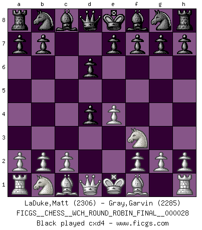 Last move : 1/2-1/2 2025 December 16 3:39:15 [Event "FICGS__CHESS__WCH_ROUND_ROBIN_FINAL__000028"] [Site "FICGS"] [Date "2025.08.31"] [Round "1"] [White "LaDuke,Matt"] [Black "Gray,Garvin"] [Result "1/2-1/2"] [WhiteElo "2306"] [BlackElo "2285"] 1.Nf3 c5 2.e4 d6 3.d4 cxd4 4.Nxd4 Nf6 5.Nc3 a6 6.f3 e5 7.Nb3 Be6 8.Be3 h5 9.Qd2 Nbd7 10.Nd5 Nxd5 11.exd5 Bf5 12.Na5 Be7 13.Be2 Bh4+ 14.g3 Bf6 15.Nxb7 Qb8 16.Na5 Qxb2 17.Kf2 Qxc2 18.Qxc2 Bxc2 19.Rac1 Ba4 20.Bd1 Bxd1 21.Rhxd1 Be7 22.Nc6 Rc8 23.Rb1 Nf6 24.Rb6 Bd8 25.Rxa6 Kd7 26.a4 Nxd5 27.Nxd8 Rc2+ 28.Ke1 Nxe3 29.Raxd6+ Kc8 30.Nxf7 Ng2+ 31.Kf1 Ne3+ 32.Kg1 Nxd1 33.Nxh8 Ne3 34.Rd3 Rg2+ 35.Kh1 Re2 36.Rc3+ Kd7 37.h3 Nf5 38.Ra3 Nxg3+ 39.Kg1 h4 1/2-1/2 Follow this game move after move (download)Not all artists are Chess players, but all Chess players are artists. (Marcel Duchamp) Am wohlsten fühle ich mich, wenn ich sehe, wie sich mein Gegner im Todeskampf windet. (Robert James Fischer) Las leyes del Ajedrez no permiten una libre elección: tienes que mover quieras o no. (Emanuel Lasker) On est toujours la mazette de quelqu'un d'autre. (Anonyme) Logic : The art of thinking and reasoning in strict accordance with the limitations and incapacities of the human misunderstanding. (Ambrose Bierce)