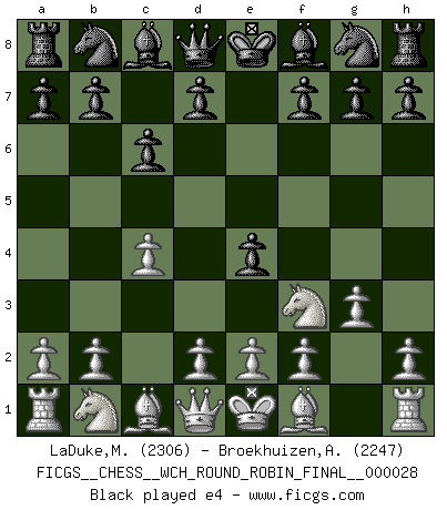 Last move : 1/2-1/2 2025 October 24 2:6:5 [Event "FICGS__CHESS__WCH_ROUND_ROBIN_FINAL__000028"] [Site "FICGS"] [Date "2025.08.31"] [Round "2"] [White "LaDuke,Matt"] [Black "Broekhuizen,A. T. S."] [Result "1/2-1/2"] [WhiteElo "2306"] [BlackElo "2247"] 1.c4 e5 2.g3 c6 3.Nf3 e4 4.Nd4 d5 5.cxd5 Qxd5 6.Nc2 Nf6 7.Nc3 Qe5 8.Bg2 Na6 9.O-O Be7 10.Ne3 O-O 11.a3 Re8 12.b4 Bf8 13.Bb2 Qh5 14.Qc2 Bh3 15.Nxe4 Nxe4 16.Bxe4 Bxf1 17.Kxf1 Qxh2 18.Ng4 Qh3+ 19.Kg1 Rxe4 1/2-1/2 Follow this game move after move (download)There's never before been a Chess player with such a thorough knowledge of the intricacies of the game and such an absolutely indomitable will to win. I think Bobby is the greatest player that ever lived. (Lisa Lane) Ich bin stolz ein Bulgare zu sein. (Veselin Topalov) Nunca nadie ha ganado una partida de Ajedrez rindiendose. (Unknown) La solitude du joueur d'Echecs à l'approche du mat est semblable à celle du condamné. (Francis Szpiner) When you've done things right people won't know you've done anything at all. (Futurama)