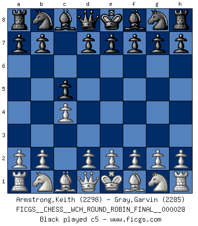 Last move : 1/2-1/2 2025 November 23 7:50:11 [Event "FICGS__CHESS__WCH_ROUND_ROBIN_FINAL__000028"] [Site "FICGS"] [Date "2025.08.31"] [Round "2"] [White "Armstrong,Keith"] [Black "Gray,Garvin"] [Result "1/2-1/2"] [WhiteElo "2298"] [BlackElo "2285"] 1.c4 c5 2.Nf3 Nf6 3.Nc3 e6 4.g3 d5 5.cxd5 exd5 6.d4 Nc6 7.Bg2 cxd4 8.Nxd4 Bc5 9.Nb3 Bb4 10.O-O Bxc3 11.bxc3 O-O 12.Bg5 h6 13.Bxf6 Qxf6 14.Qxd5 Qxc3 15.Qb5 Nd4 16.Nxd4 Qxd4 17.e3 Qc3 18.Bxb7 Rb8 19.Qc6 Qa3 20.Bxc8 Rbxc8 1/2-1/2 Follow this game move after move (download)On the chessboard, lies and hypocrisy do not survive long. (Emanuel Lasker) Ich verstehe Aljechins Kombinationen ganz gut; aber woher er diese Angriffschancen bekommt und wie er die Eröffnung behandelt das ist für mich ein Buch mit sieben Siegeln. (Rudolf Spielmann) Observen a Garry Kasparov. Después de una derrota, invariablemente el gana la próxima partida. Prácticamente hace pedazos a su siguiente oponente. Eso es algo que tenemos que aprender a lograr. (Maurice Ashley) Toute estimation doit être constamment réévaluée. (Jacob Estrin) Wikichess, chess moves explained by 'experimented' players. (Thibault de Vassal)