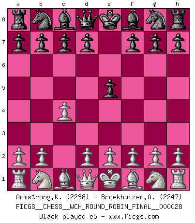 Last move : 1/2-1/2 2025 November 4 3:22:52 [Event "FICGS__CHESS__WCH_ROUND_ROBIN_FINAL__000028"] [Site "FICGS"] [Date "2025.08.31"] [Round "1"] [White "Armstrong,Keith"] [Black "Broekhuizen,A. T. S."] [Result "1/2-1/2"] [WhiteElo "2298"] [BlackElo "2247"] 1.c4 e5 2.g3 c6 3.Nf3 e4 4.Nd4 d5 5.cxd5 Qxd5 6.Nc2 Nf6 7.Nc3 Qe5 8.Bg2 Na6 9.O-O Be7 10.Ne3 O-O 11.a3 Rd8 12.b4 c5 13.Bb2 cxb4 14.axb4 Nxb4 15.Qb1 Qh5 16.Rc1 a5 17.Nxe4 Ng4 1/2-1/2 Follow this game move after move (download)You need not play well - just help your opponent to play badly. (Genrikh Chepukaitis) Ich verstehe den Grund nicht, warum die Aufteilung in Frauen und Männer überhaupt im Schach besteht. (Judith Polgar) Los tropiezos estan todos ahí en el tablero, esperando que se cometan. (Savielly Tartakover) Ce qui caractérise les parties de combat, c'est que si le défenseur a constamment de difficiles problèmes à résoudre, l'attaquant doit chercher sans relâche de nouvelles possibilités d'attaque. (Koblentz) The human is the only animal species whose members are able to talk themselves into difficulties that would not otherwise exist. (Wendell Johnson)