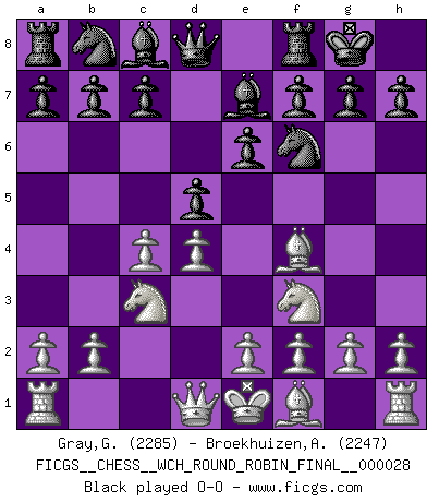 Last move : 1/2-1/2 2025 November 4 7:13:7 [Event "FICGS__CHESS__WCH_ROUND_ROBIN_FINAL__000028"] [Site "FICGS"] [Date "2025.08.31"] [Round "1"] [White "Gray,Garvin"] [Black "Broekhuizen,A. T. S."] [Result "1/2-1/2"] [WhiteElo "2285"] [BlackElo "2247"] 1.d4 Nf6 2.c4 e6 3.Nf3 d5 4.Nc3 Be7 5.Bf4 O-O 6.e3 b6 7.Bd3 Ba6 8.cxd5 Bxd3 9.Qxd3 Nxd5 10.Nxd5 Qxd5 11.Bxc7 Qa5+ 12.Kf1 Na6 13.Bg3 Nb4 14.Qe2 Qa4 15.a3 Rac8 16.Kg1 Nd5 17.h4 Rc2 1/2-1/2 Follow this game move after move (download)The passed Pawn is a criminal, who should be kept under lock and key. Mild measures, such as police surveillance, are not sufficient. (Aaron Nimzovich) Die Idee von Capablanca, Schach als Fach in den Schulen zu lehren, ist großartig. (Fidel Castro) Debemos de asegurarnos de que el Ajedrez no se convierta en un lenguaje muerto, muy interesante, pero solo para un grupo muy pequeño. (Sytze Faber) A ce moment-là, je menaçais de comprendre la position ! (Clément L'Heureux) Programming can only do so much before it becomes too much. (Don Groves)