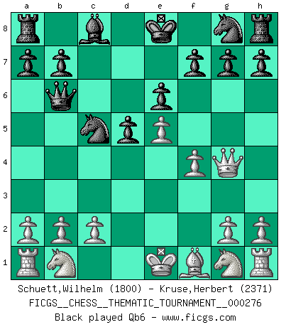 Last move : 1/2-1/2 2025 December 24 17:42:39 [Event "FICGS__CHESS__THEMATIC_TOURNAMENT__000276"] [Site "FICGS"] [Date "2025.09.01"] [Round "1"] [White "Schuett,Wilhelm"] [Black "Kruse,Herbert"] [Result "1/2-1/2"] [WhiteElo "1800"] [BlackElo "2371"] 1.e4 c6 2.d4 d5 3.e5 c5 4.dxc5 e6 5.Be3 Nd7 6.f4 Bxc5 7.Bxc5 Nxc5 8.Qg4 Qb6 9.Qxg7 Qxb2 10.Qxh8 Kf8 11.Nd2 Qxa1+ 12.Ke2 b6 13.Ngf3 Qc3 14.Qxh7 f6 15.Kf2 Ne4+ 16.Nxe4 Qxc2+ 17.Kg3 Qxe4 18.Qxe4 dxe4 19.Nh4 f5 20.Bc4 Bd7 21.Rd1 Rc8 22.Rxd7 Rxc4 23.Ng6+ Ke8 24.Rxa7 Rc3+ 25.Kf2 Rc2+ 26.Kf1 Rc1+ 27.Ke2 Rc2+ 28.Kf1 Rc1+ 29.Kf2 Rc2+ 30.Kf1 1/2-1/2 Follow this game move after move (download)There just isn't enough televised Chess. (David Letterman) Der 70jährige Viktor Kortschnoi: Die Rentenanstalt wollte mich zwingen in Rente zu gehen. Meine Frau erhält jetzt eine Pension- und ich zahle weiter in die Rentenkasse ein! (Viktor Kortschnoi) En el Ajedrez, tal como es jugado por los Maestros, practicamente la suerte es eliminada. (Emanuel Lasker) Le plus grand jeu de l'esprit jamais inventé, plus vous l'apprenez, plus vous y prenez du plaisir. (Garry Kasparov) You cannot beat a roulette table unless you steal money from it. (Albert Einstein)