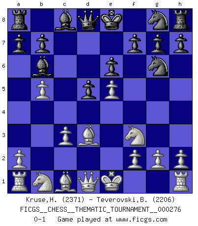 Last move : 0-1 2025 September 8 15:17:42 [Event "FICGS__CHESS__THEMATIC_TOURNAMENT__000276"] [Site "FICGS"] [Date "2025.09.01"] [Round "1"] [White "Kruse,Herbert"] [Black "Teverovski,Bogoljub"] [Result "0-1"] [WhiteElo "2371"] [BlackElo "2206"] 1.e4 c6 2.d4 d5 3.e5 c5 4.Nf3 Nc6 5.dxc5 e6 6.c3 Bxc5 7.b4 Bb6 8.b5 Nce7 9.Bd3 Ng6 0-1 Follow this game move after move (download)Best by test: 1. e4 (Bobby Fischer) Je älter ich werde, um so mehr schätze ich die Bauern. (Paul Keres) Botvinnik trataba de restarle el misterio al Ajedrez, siempre relacionandolo a situaciones de la vida ordinaria. El gustaba de llamar al Ajedrez un típico problema inexacto similar a aquellos de los cuales la gente siempre tiene que enfrentarse en la vida cotidiana. (Garry Kasparov) Nous vivons dans un monde échiquéen : chaque jour qui passe est un défi à relever. (Philosophe Sasha) Art is not a thing, it is a way. (Elbert Hubbard)