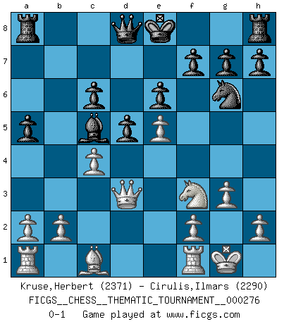 Last move : 0-1 2025 September 8 11:25:59 [Event "FICGS__CHESS__THEMATIC_TOURNAMENT__000276"] [Site "FICGS"] [Date "2025.09.01"] [Round "1"] [White "Kruse,Herbert"] [Black "Cirulis,Ilmars"] [Result "0-1"] [WhiteElo "2371"] [BlackElo "2290"] 1.e4 c6 2.d4 d5 3.e5 c5 4.Nf3 cxd4 5.Nxd4 Nc6 6.Nxc6 bxc6 7.Bd3 e6 8.O-O Ne7 9.Nd2 a5 10.Nf3 Ba6 11.Bxa6 Rxa6 12.c4 Ng6 13.Qd3 Ra8 14.g3 Bc5 0-1 Follow this game move after move (download)Chess is a foolish expedient for making idle people believe they are doing something very clever when they are only wasting their time. (George Bernard Shaw) Versuche, dich von der Sklaverei der Eröffnungsvarianten zu befreien. Stattdessen soll man gewisse Typenpositionen erlernen, die man eingehend analysiert. (Aaron Nimzowitsch) Yo jugué Ajedrez con el y a veces le pude haber ganado solo que siempre devuelve su última jugada y juega la partida de manera diferente. (Mark Twain) Avant la finale, les dieux ont créé le milieu de partie. (Tarrasch) The worth of a book is to be measured by what you can carry away from it. (James Bryce)