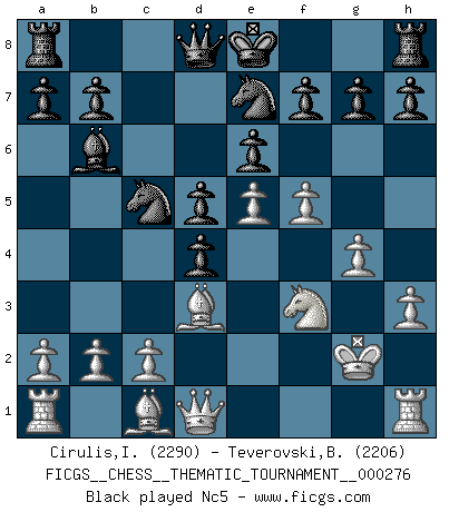 Last move : 1/2-1/2 2025 September 18 22:28:39 [Event "FICGS__CHESS__THEMATIC_TOURNAMENT__000276"] [Site "FICGS"] [Date "2025.09.01"] [Round "1"] [White "Cirulis,Ilmars"] [Black "Teverovski,Bogoljub"] [Result "1/2-1/2"] [WhiteElo "2290"] [BlackElo "2206"] 1.e4 c6 2.d4 d5 3.e5 c5 4.f4 cxd4 5.Nf3 Bg4 6.Nbd2 e6 7.h3 Bxf3 8.Nxf3 Bb4+ 9.Kf2 Bc5 10.g4 Nd7 11.Bd3 Ne7 12.Kg2 Bb6 13.f5 Nc5 14.Bg5 Nxd3 15.cxd3 h6 16.Qa4+ Qd7 17.Qxd7+ Kxd7 18.Bxe7 Kxe7 19.Rhf1 Rac8 20.Rf2 exf5 21.gxf5 g6 22.Nh4 Rhg8 23.Raf1 Ke8 24.Re2 Rc6 25.Kh1 a6 1/2-1/2 Follow this game move after move (download)Fischer sacrificed virtually everything most of us weakies (to use his term) value, respect, and cherish, for the sake of an artful, often beautiful board game, for the ambivalent privilege of being its greatest master. (Paul Kollar) Mit sehr nachdenklichem Gesicht schreitet Bobby durch den Turniersaal. Was ist passiert?, fragt Lombardy. Ich stehe schlecht, antwortet Fischer. Lombardy: Dann biete doch einfach Remis an. Fischer: So schlecht stehe ich nun auch wieder nicht! (Robert James Fischer) Tu sabes que vas a perder. Aún cuando tenía la ventaja, yo sabía que iba a perder. - al estar jugando con Fischer (Andrew Soltis) Je menace de comprendre la position. (Anonyme) Excelling at chess has long been considered a symbol of more general intelligence. That is an incorrect assumption in my view, as pleasant as it might be. But for the purposes of argument and investigation, chess is, in Russkin-Gutman's words, 'an unparalleled laboratory, since both the learning process and the degree of ability obtained can be objectified and quantified, providing an excellent comparative framework on which to use rigorous analytical techniques.' (The Chess Master and the Computer, by Garry Kasparov - 2010)
